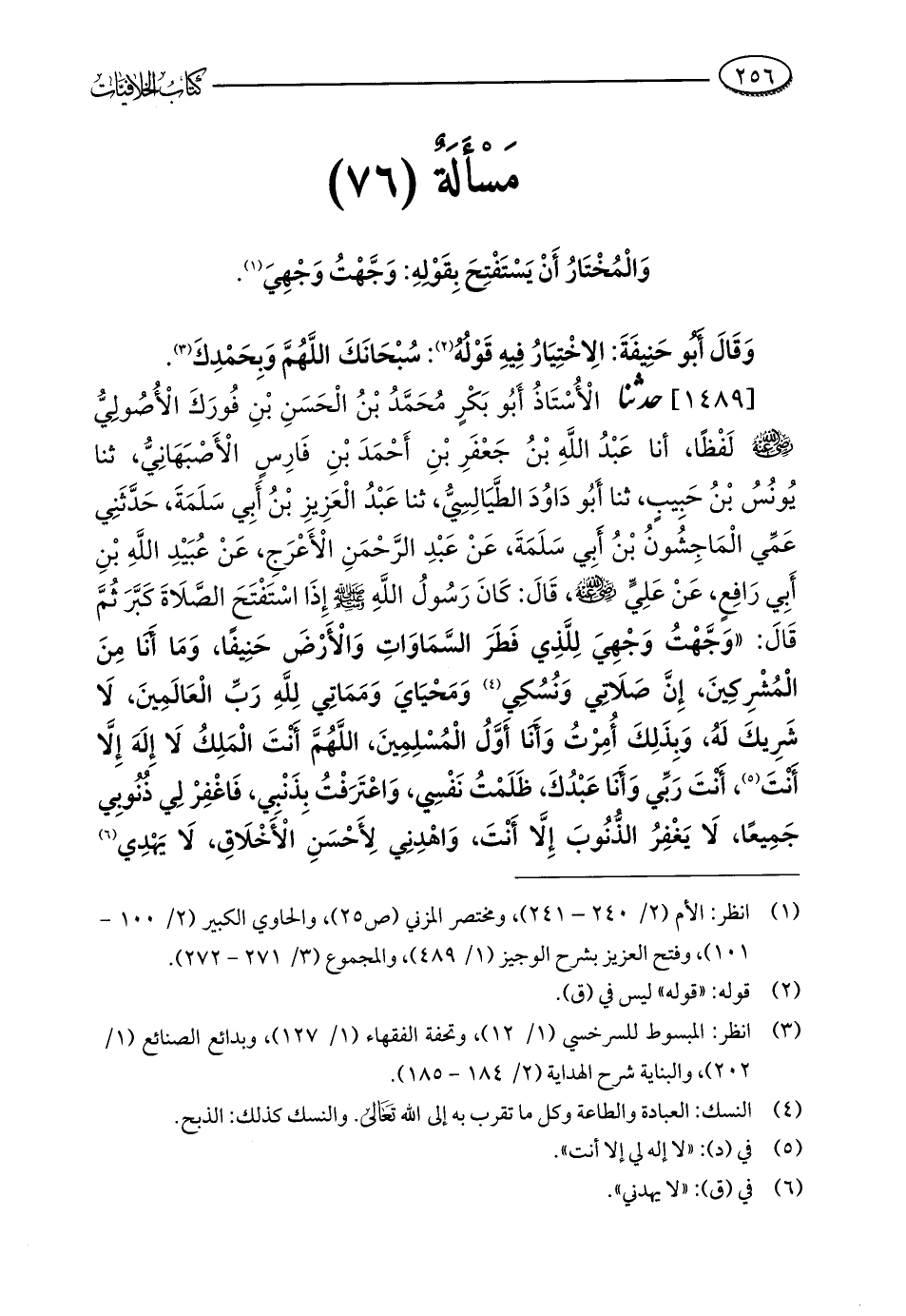 [1489] حدثنا الْأُسْتَاذُ أَبُو بَكْرٍ مُحَمَّدُ بْنُ الْحَسَنِ بْنِ فُورَكَ الْأُصُولِيُّ - رضي الله عنه - لَفْظًا، أنا عَبْدُ اللَّهِ بْنُ جَعْفَرِ بْنِ أَحْمَدَ بْنِ فَارِسٍ الْأَصْبَهَانِيُّ، ثنا يُونُسُ بْنُ حَبِيبٍ، ثنا أَبُو دَاوُدَ الطَّيَالِسِيُّ، ثنا عَبْدُ الْعَزِيزِ بْنُ أَبِي سَلَمَةَ، حَدَّثَنِي عَمِّي الْمَاجِشُونُ بْنُ أَبِي سَلَمَةَ، عَنْ عَبْدِ الرَّحْمَنِ الْأَعْرَجِ، عَنْ عُبَيْدِ اللَّهِ بْنِ أَبِي رَافِعٍ، عَنْ عَلِيٍّ - رضي الله عنه -، قَالَ: كَانَ رَسولُ اللَّهِ - صلى الله عليه وسلم - إِذَا اسْتَفْتَحَ الصَّلَاةَ كَبَّرَ ثُمَّ قَالَ: "وَجَّهْتُ وَجْهِيَ لِلَّذِي فَطَرَ السَّمَاوَاتِ وَالْأَرْضَ حَنِيفًا، وَمَا أَنَا مِنَ الْمُشْرِكينَ، إِنَّ صَلَاتِي وَنُسُكِي (¬4) وَمَحْيَايَ وَمَمَاتِي لِلَّهِ رَبِّ الْعَالَمِينَ، لَا شَرِيكَ لَهُ، وَبِذَلِكَ أُمِرْتُ وَأَنا أَوَّلُ الْمُسْلِمِينَ، اللَّهُمَّ أَنْتَ الْمَلِكُ لَا إِلَهَ إِلَّا أَنْتَ (¬5)، أَنْتَ رَبِّي وَأَنَا عَبْدُكَ، ظلَمْتُ نَفْسِي، وَاعْتَرَفْتُ بِذَنْبِي، فَاغْفِرْ لِي ذُنُوبِي جَمِيعًا، لَا يَغْفِرُ الذُّنُوبَ إِلَّا أَنْتَ، وَاهْدِنِي لِأَحْسَنِ الْأَخْلَاقِ، لَا يَهْدِي (¬6)