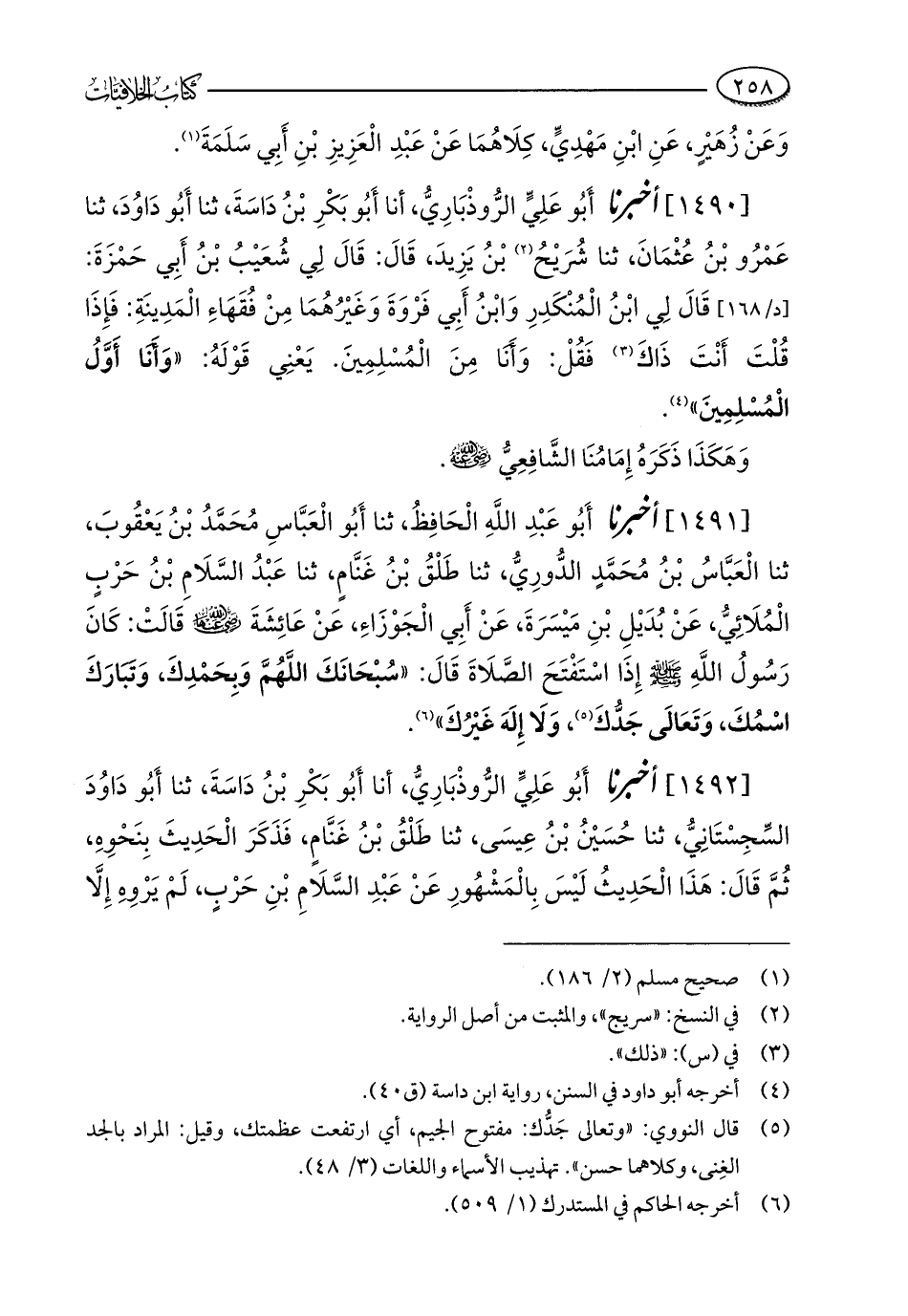 [1491] أخبرنا أَبُو عَبْدِ اللَّهِ الْحَافِظُ، ثنا أَبُو الْعَبَّاسِ مُحَمَّدُ بْنُ يَعْقُوبَ، ثنا الْعَبَّاسُ بْنُ مُحَمَّدٍ الدُّورِيُّ، ثنا طَلْقُ بْنُ غَنَّامٍ، ثنا عَبْدُ السَّلَامِ بْنُ حَرْبٍ الْمُلَائِيُّ، عَنْ بُدَيْلِ بْنِ مَيْسَرَةَ، عَنْ أَبِي الْجَوْزَاءِ، عَنْ عَائِشَةَ - رضي الله عنها - قَالَتْ: كَانَ رَسُولُ اللَّه - صلى الله عليه وسلم - إِذَا اسْتَفْتَحَ الصَّلَاةَ قَالَ: "سُبْحَانَكَ اللَّهُمَّ وَبِحَمْدِكَ، وَتَبَارَكَ اسْمُكَ، وَتَعَالَى جَدُّكَ (¬5)، وَلَا إِلَهَ غَيْرُكَ" (¬6).