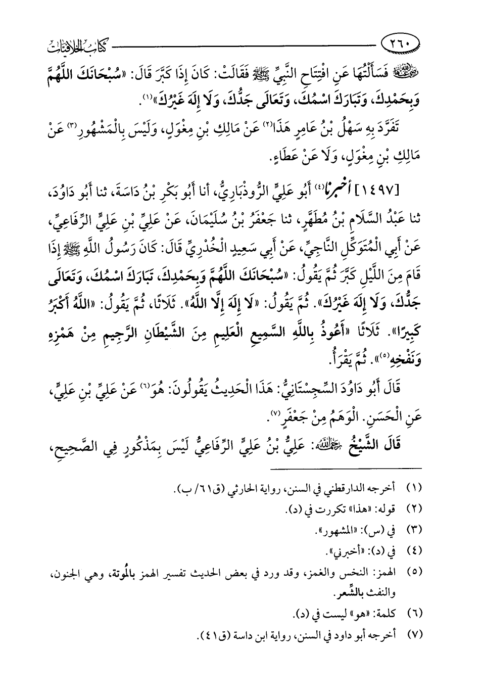 [1497] أخبرنا (¬4) أَبُو عَلِيٍّ الرُّوذْبَارِيُّ، أنا أَبُو بَكْرِ بْنُ دَاسَةَ، ثنا أَبُو دَاوُدَ، ثنا عَبْدُ السَّلَامِ بْنُ مُطَهَّرٍ، ثنا جَعْفَرُ بْنُ سُلَيْمَانَ، عَنْ عَلِيِّ بْنِ عَلِيٍّ الرِّفَاعِيِّ، عَنْ أَبِي الْمُتَوَكِّلِ النَّاجِيِّ، عَنْ أَبِي سَعِيدٍ الْخُدْرِيِّ قَالَ: كَانَ رَسُولُ اللَّهِ - صلى الله عليه وسلم - إذَا قَامَ مِنَ اللَّيْلِ كَبَّرَ ثُمَّ يَقُولُ: "سُبْحَانَكَ اللَّهُمَّ وَبِحَمْدِكَ، تَبَارَكَ اسْمُكَ، وَتَعَالَى جَدُّكَ، وَلَا إِلَهَ غَيْرُكَ". ثُمَّ يَقُولُ: "لَا إِلَهَ إِلَّا اللَّهُ". ثَلَاثًا، ثُمَّ يَقُولُ: "اللَّهُ أَكْبَرُ كبِيرًا". ثَلَاثًا "أَعُوذُ بِاللَّهِ السَّمِيعِ الْعَلِيمِ مِنَ الشَّيْطَانِ الرَّجِيمِ مِنْ هَمْزِهِ وَنَفْخِهِ (¬5) ". ثُمَّ يَقْرَأُ.