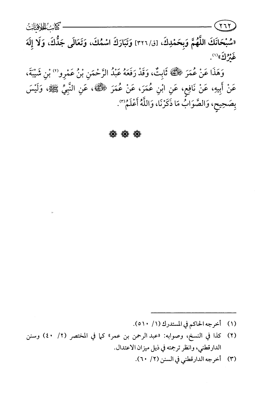 وَهَذَا عَنْ عُمَرَ - رضي الله عنه - ثَابِتٌ، وَقَدْ رَفَعَهُ عَبْدُ الرَّحْمَنِ بْنُ عَمْرِو (¬2) بْنِ شَيْبَةَ، عَنْ أَبِيهِ، عَنْ نَافِعٍ، عَنِ ابْنِ عُمَرَ، عَنْ عُمَرَ - رضي الله عنه -، عَنِ النَّبِيِّ - صلى الله عليه وسلم -، وَلَيْسَ بِصَحِيحٍ، وَالصَّوَابُ مَا ذَكَرْنَا، وَاللَّهُ أَعْلَمُ (¬3).