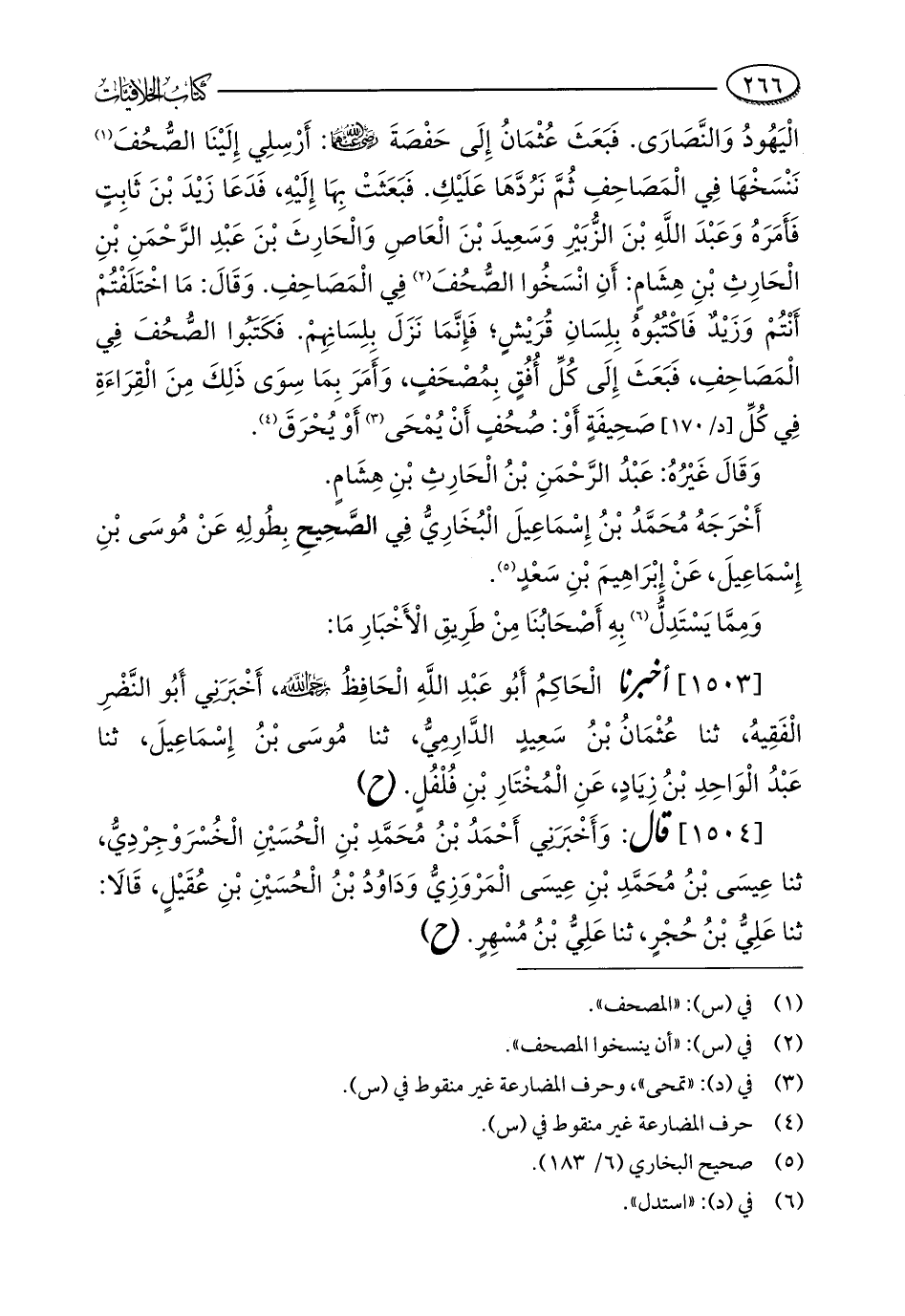 الْيَهُودُ وَالنَّصَارَى. فَبَعَثَ عُثْمَانُ إِلَى حَفْصَةَ - رضي الله عنهما -: أَرْسِلِي إِلَيْنَا الصُّحُفَ (¬1) نَنْسَخْهَا فِي الْمَصَاحِفِ ثُمَّ نَرُدَّهَا عَلَيْكِ. فَبَعَثَتْ بِهَا إِلَيْهِ، فَدَعَا زَيْدَ بْنَ ثَابِتٍ فَأَمَرَهُ وَعَبْدَ اللَّهِ بْنَ الزُّبَيْرِ وَسَعِيدَ بْنَ الْعَاصِ وَالْحَارِثَ بْنَ عَبْدِ الرَّحْمَنِ بْنِ الْحَارِثِ بْنِ هِشَامٍ: أَنِ انْسَخُوا الصُّحُفَ (¬2) فِي الْمَصَاحِفِ. وَقَالَ: مَا اخْتَلَفْتُمْ أَنْتُمْ وَزَيْدٌ فَاكْتُبُوهُ بِلِسَانِ قُرَيْشٍ؛ فَإِنَّمَا نَزَلَ بلِسَانِهِمْ. فَكَتَبُوا الصُّحُفَ فِي الْمَصَاحِفِ، فَبَعَثَ إِلَى كُلِّ أُفُقٍ بِمُصْحَفٍ، وَأَمَرَ بِمَا سِوَى ذَلِكَ مِنَ الْقِرَاءَةِ فِي كُلِّ صَحِيفَةٍ أَوْ: صُحُفٍ أَنْ يُمْحَى (¬3) أَوْ يُحْرَقَ (¬4).