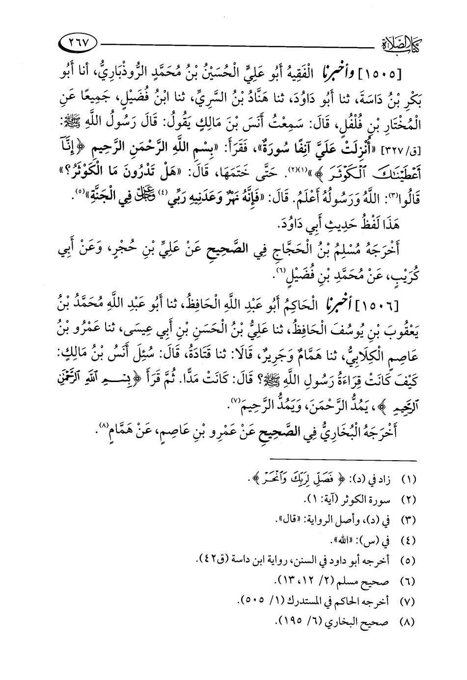[1505] وأخبرنا الْفَقِيهُ أَبُو عَلِيٍّ الْحُسَيْنُ بْنُ مُحَمَّدٍ الرُّوذْبَارِيُّ، أنا أَبُو بَكْرِ بْنُ دَاسَةَ، ثنا أَبُو دَاوُدَ، ثنا هَنَّادُ بْنُ السَّرِيِّ، ثنا ابْنُ فُضَيْلٍ، جَمِيعًا عَنِ الْمُخْتَارِ بْن فُلْفُلٍ، قَالَ: سَمِعْتُ أَنَسَ بْنَ مَالِكٍ يَقُولُ: قَالَ رَسُولُ اللَّهِ - صلى الله عليه وسلم -: "أُنْزِلَتْ عَلَيَّ آنِفًا سُورَةٌ"، فَقَرَأَ: "بِسْمِ اللَّهِ الرَّحْمَنِ الرَّحِيمِ {إِنَّا أَعْطَيْنَاكَ الْكَوْثَرَ} " (¬1) (¬2). حَتَّى خَتَمَهَا، قَالَ: "هَلْ تَدْرُونَ مَا الْكَوْثَرُ؟ " قَالُوا (¬3): اللَّهُ وَرَسُولُهُ أَعْلَمُ. قَالَ: "فَإِنَّهُ نَهْرٌ وَعَدَنِيهِ رَبِّي (¬4) - عز وجل - فِي الْجَنَّةِ" (¬5).