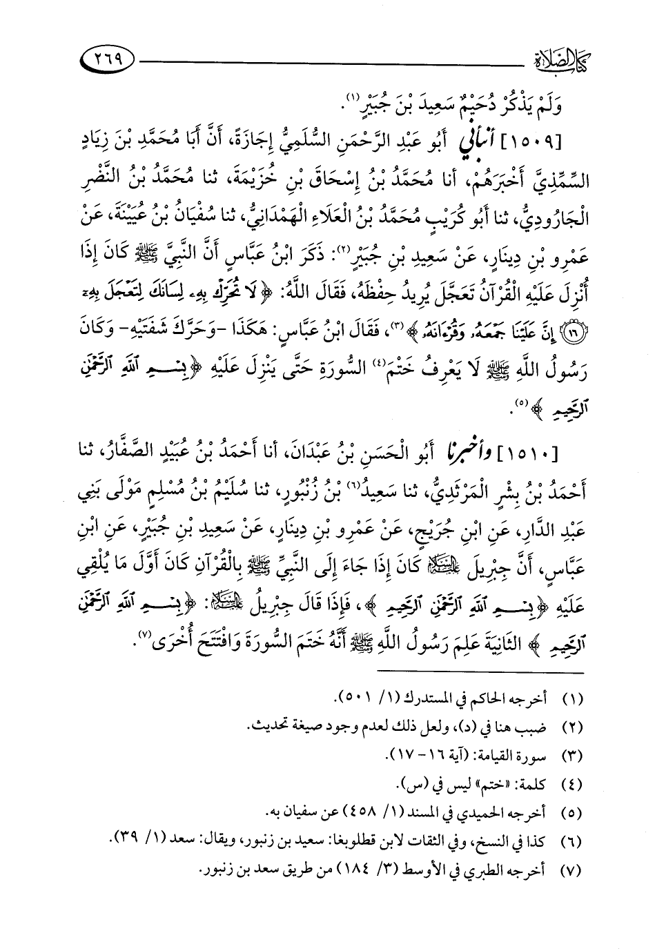 [1509] أنبأني أَبُو عَبْدِ الرَّحْمَنِ السُّلَمِيُّ إِجَازَةً، أَنَّ أَبَا مُحَمَّدِ بْنَ زِيَادٍ السِّمِّذِيَّ أَخْبَرَهُمْ، أنا مُحَمَّدُ بْنُ إِسْحَاقَ بْنِ خُزَيْمَةَ، ثنا مُحَمَّدُ بْنُ النَّضْرِ الْجَارُودِيُّ، ثنا أَبُو كُرَيْبٍ مُحَمَّدُ بْنُ الْعَلَاءِ الْهَمْدَانِيُّ، ثنا سُفْيَانُ بْنُ عُيَيْنَةَ، عَنْ عَمْرِو بْنِ دِينَارٍ، عَنْ سَعِيدِ بْنِ جُبَيْرٍ (¬2): ذَكَرَ ابْنُ عَبَّاسٍ أَنَّ النَّبِيَّ - صلى الله عليه وسلم - كانَ إِذَا أُنْزِلَ عَلَيْهِ الْقُرْآنُ تَعَجَّلَ يُرِيدُ حِفْظَهُ، فَقَالَ اللَّهُ: {لَا تُحَرِّكْ بِهِ لِسَانَكَ لِتَعْجَلَ بِهِ (16) إِنَّ عَلَيْنَا جَمْعَهُ وَقُرْآنَهُ} (¬3)، فَقَالَ ابْنُ عَبَّاسٍ: هَكَذَا - وَحَرَّكَ شَفَتَيْهِ - وَكَانَ رَسُولُ اللَّهِ - صلى الله عليه وسلم - لَا يَعْرِفُ خَتْمَ (¬4) السُّورَةِ حَتَّى يَنْزِلَ عَلَيْهِ {بِسْمِ اللَّهِ الرَّحْمَنِ الرَّحِيمِ} (¬5).