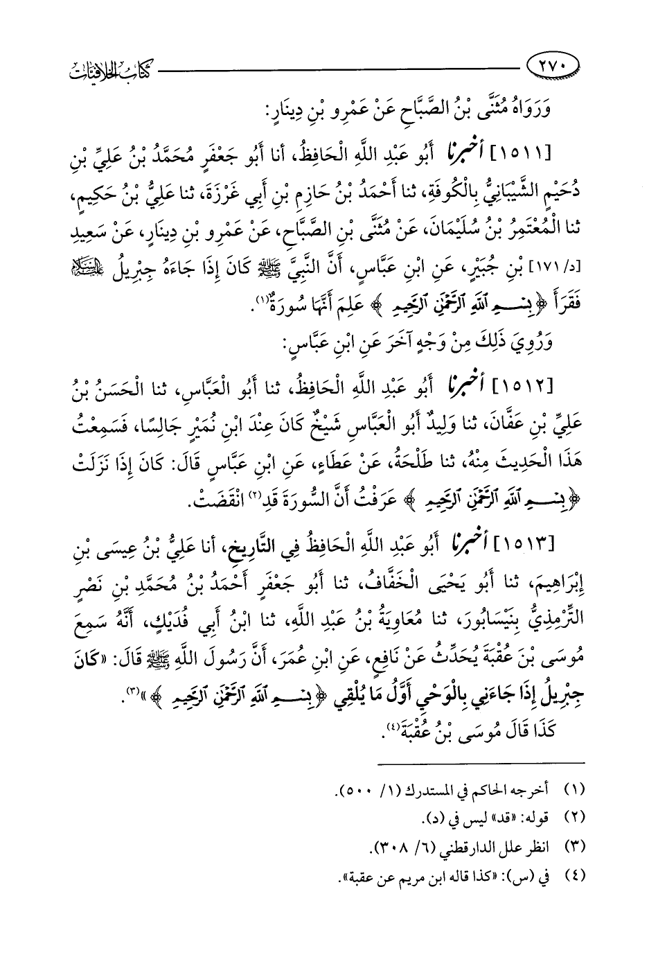 [1513] أخبرنا أَبُو عَبْدِ اللَّهِ الْحَافِظُ فِي التَّارِيخِ، أنا عَلِيُّ بْنُ عِيسَى بْنِ إِبْرَاهِيمَ، ثنا أَبُو يَحْيَى الْخَفَّافُ، ثنا أَبُو جَعْفَرٍ أَحْمَدُ بْنُ مُحَمَّدِ بْنِ نَصْرٍ التِّرْمذِيُّ بِنَيْسَابُورَ، ثنا مُعَاوِيَةُ بْنُ عَبْدِ اللَّهِ، ثنا ابْنُ أَبِي فُدَيْكٍ، أَنَّهُ سَمِعَ مُوسَى بْنَ عُقْبَةَ يُحَدِّثُ عَنْ نَافِعٍ، عَنِ ابْنِ عُمَرَ، أَنَّ رَسُولَ اللَّهِ - صلى الله عليه وسلم - قَالَ: "كَانَ جِبْرِيلُ إذَا جَاءَنِي بِالْوَحْيِ أَوَّلُ مَا يُلْقِي {بِسْمِ اللَّهِ الرَّحْمَنِ الرَّحِيمِ} " (¬3).