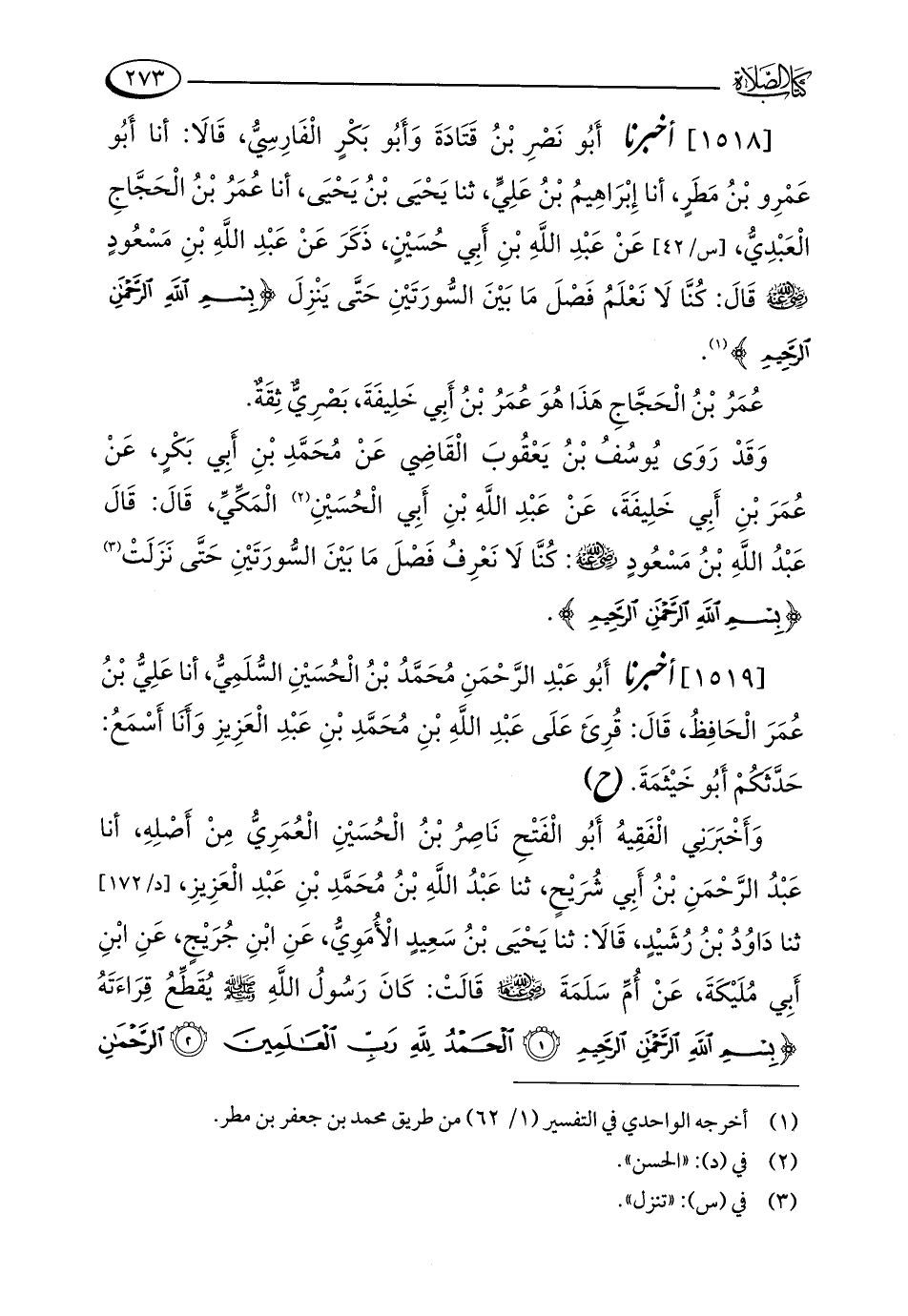 [1518] أخبرنا أَبُو نَصْرِ بْنُ قَتَادَةَ وَأَبُو بَكْرٍ الْفَارِسِيُّ، قَالَا: أنا أَبُو عَمْرِو بْنُ مَطَرٍ، أنا إِبْرَاهِيمُ بْنُ عَلِيٍّ، ثنا يَحْيَى بْنُ يَحْيَى، أنا عُمَرُ بْنُ الْحَجَّاجِ الْعَبْدِيُّ، عَنْ عَبْدِ اللَّهِ بْنِ أَبِي حُسَيْنٍ، ذَكَرَ عَنْ عَبْدِ اللَّهِ بْنِ مَسْعُودٍ - رضي الله عنه - قَالَ: كُنَّا لَا نَعْلَمُ فَصْلَ مَا بَيْنَ السُّورَتَيْنِ حَتَّى يَنْزِلَ {بِسْمِ اللَّهِ الرَّحْمَنِ الرَّحِيمِ} (¬1).