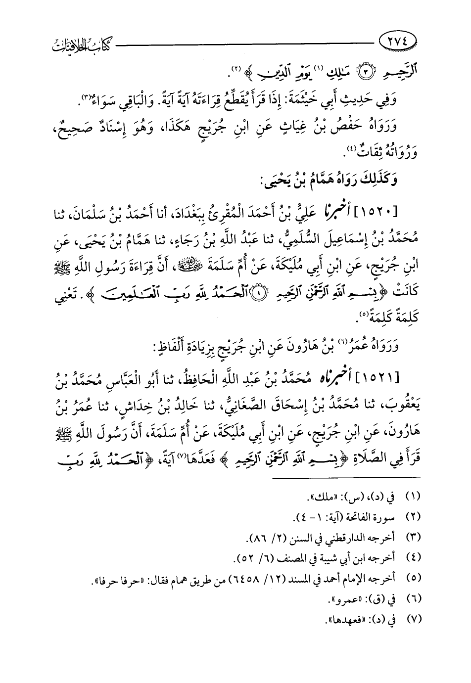 [1520] أخبرنا عَلِيُّ بْنُ أَحْمَدَ الْمُقْرِئُ بِبَغْدَادَ، أنا أَحْمَدُ بْنُ سَلْمَانَ، ثنا مُحَمَّدُ بْنُ إِسْمَاعِيلَ السُّلَمِيُّ، ثنا عَبْدُ اللَّهِ بْنُ رَجَاءٍ، ثنا هَمَّامُ بْنُ يَحْيَى، عَنِ ابْنِ جُرَيْجٍ، عَنِ ابْنِ أَبِي مُلَيْكَةَ، عَنْ أُمِّ سَلَمَةَ - رضي الله عنها -، أَنَّ قِرَاءَةَ رَسُولِ اللَّهِ - صلى الله عليه وسلم - كَانَتْ {بِسْمِ اللَّهِ الرَّحْمَنِ الرَّحِيمِ (1) الْحَمْدُ لِلَّهِ رَبِّ الْعَالَمِينَ}. تَعْنِي كَلِمَةً كَلِمَةً (¬5).