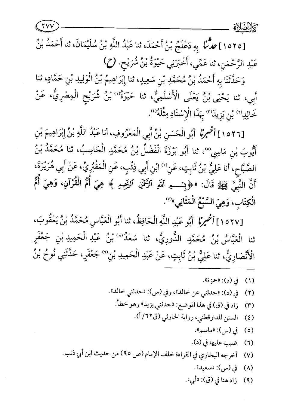 [1526] أخبرنا أَبُو الْحَسَنِ بْنُ أَبِي الْمَعْرُوفِ، أنا عَبْدُ اللَّهِ بْنُ إِبْرَاهِيمَ بْنِ أَيُّوبَ بْنِ مَاسِي (¬5)، ثنا أَبُو بَرْزَةَ الْفَضْلُ بْنُ مُحَمَّدٍ الحَاسِبُ، ثنا مُحَمَّدُ بن الصَّبَّاحِ، أنا عَلِيُّ بْنُ ثَابِتٍ، عَنِ (¬6) ابْنِ أَبِي ذِئْبٍ، عَنِ الْمَقْبُرِيِّ، عَنْ أَبِي هُرَيْرَةَ، أَنَّ النَّبِيَّ - صلى الله عليه وسلم - قَالَ: " {بِسْمِ اللَّهِ الرَّحْمَنِ الرَّحِيمِ} هِيَ أُمُّ الْقُرْآنِ، وَهِيَ أُمُّ الْكِتَابِ، وَهِيَ السَّبْعُ الْمَثَانِي" (¬7).