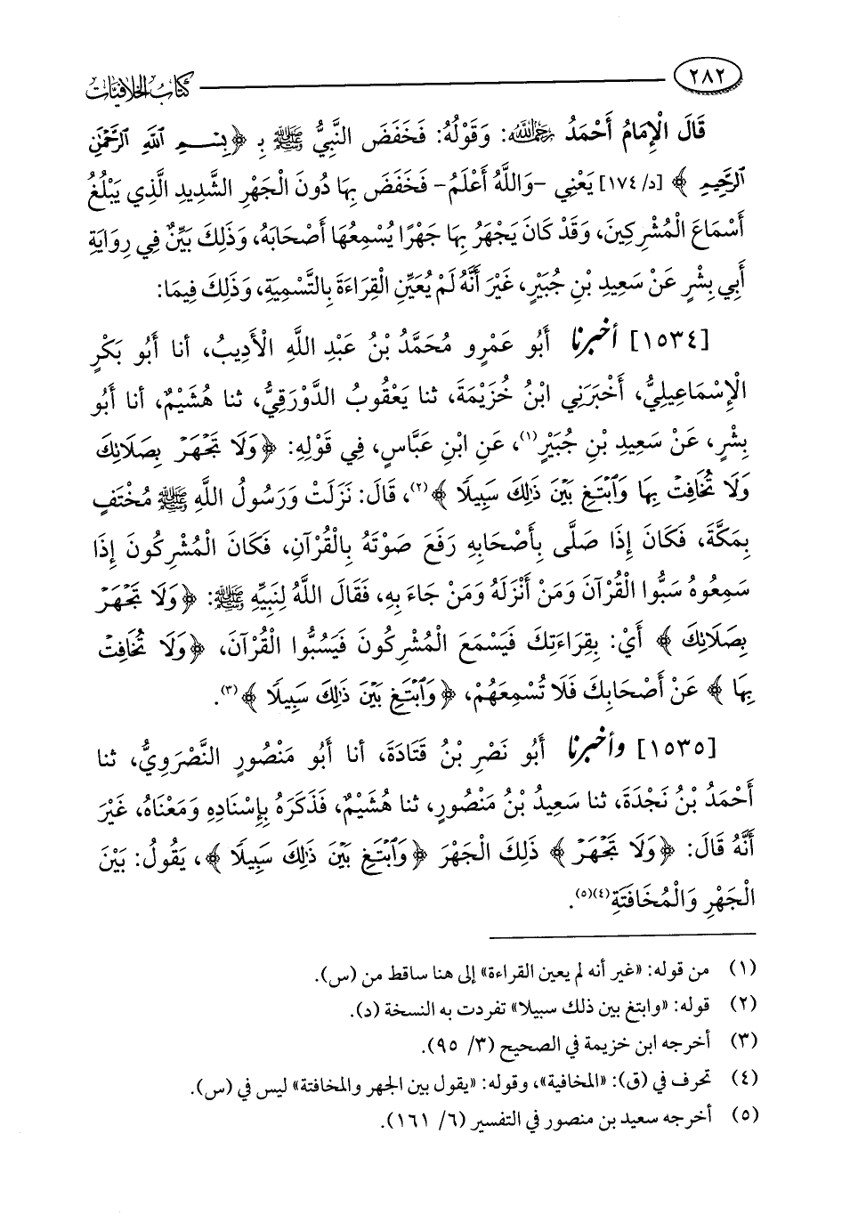 [1535] وأخبرنا أَبُو نَصْرِ بْنُ قَتَادَةَ، أنا أَبُو مَنْصُورٍ النَّصْرَوِيُّ، ثنا أَحْمَدُ بْنُ نَجْدَةَ، ثنا سَعِيدُ بْنُ مَنْصُورٍ، ثنا هُشَيْمٌ، فَذَكَرَهُ بِإِسْنَادِهِ وَمَعْنَاهُ، غَيْرَ أَنَّهُ قَالَ: {وَلَا تَجْهَرْ} ذَلِكَ الْجَهْرَ {وَابْتَغِ بَيْنَ ذَلِكَ سَبِيلًا}، يَقُولُ: بَيْنَ الْجَهْرِ وَالْمُخَافَتَةِ (¬4) (¬5).