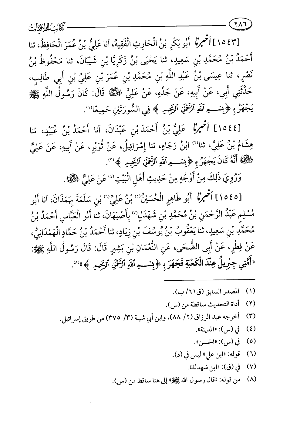 [1545] أخبرنا أَبُو طَاهِرٍ الْحُسَيْنُ (¬5) بْنُ عَلِيِّ (¬6) بْنِ سَلَمَةَ بِهَمَذَانَ، أنا أَبُو مُسْلِمٍ عَبْدُ الرَّحْمَنِ بْنُ مُحَمَّدِ بْنِ شَهْدَلٍ (¬7) بِأَصْبَهَانَ، ثنا أَبُو الْعَبَّاسِ أَحْمَدُ بْنُ مُحَمَّدِ بْنِ سَعِيدٍ، ثنا يَعْقُوبُ بْنُ يُوسُفَ بْنِ زِيَادٍ، ثنا أَحْمَدُ بْنُ حَمَّادٍ الْهَمْدَانِيُّ، عَنْ فِطْرٍ، عَنْ أَبِي الضُّحَى، عَنِ النُّعْمَانِ بْنِ بَشِيرٍ قَالَ: قَالَ رَسُولُ اللَّهِ - صلى الله عليه وسلم -: "أَمَّني جِبْرِيلُ عِنْدَ الْكَعْبَةِ فَجَهَرَ بِـ {بِسْمِ اللَّهِ الرَّحْمَنِ الرَّحِيمِ} " (¬8).