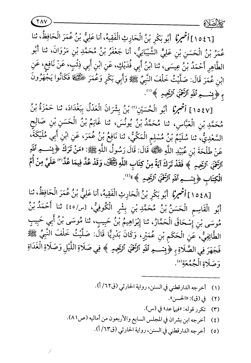 [1546] أخبرنا أَبُو بَكْرِ بْنُ الْحَارِثِ الْفَقِيهُ، أنا عَلِيُّ بْنُ عُمَرَ الْحَافِظُ، ثنا عُمَرُ بْنُ الْحَسَنِ بْنِ عَلِيٍّ الشَّيْبَانِيُّ، أنا جَعْفَرُ بْنُ مُحَمَّدِ بْنِ مَرْوَانَ، ثنا أَبُو الطَّاهِرِ أَحْمَدُ بْنُ عِيسَى، ثنا ابْنُ أَبِي فُدَيْكٍ، عَنِ ابْنِ أَبِي ذِئْبٍ، عَنْ نَافِعٍ، عَنِ ابْنِ عُمَرَ قَالَ: صَلَّيْتُ خَلْفَ النَّبِيِّ - صلى الله عليه وسلم - وأَبِي بَكْرٍ وَعُمَرَ - رضي الله عنهما - فَكَانُوا يَجْهَرُونَ بِـ {بِسْمِ اللَّهِ الرَّحْمَنِ الرَّحِيمِ} (¬1).