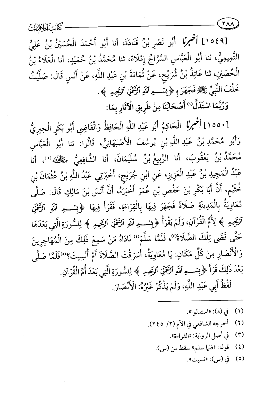 [1550] أخبرنا الْحَاكِمُ أَبُو عَبْدِ اللَّهِ الْحَافِظُ وَالْقاضِي أَبُو بَكْرٍ الْحِيرِيُّ وَأَبُو مُحَمَّدِ بْنُ عَبْدِ اللَّهِ بْنِ يُوسُفَ الْأَصْبَهَانِيُّ، قَالُوا: ثنا أَبُو الْعَبَّاسِ مُحَمَّدُ بْنُ يَعْقُوبَ، أنا الرَّبِيعُ بْنُ سُلَيْمَانَ، أنا الشَّافِعِيُّ - رحمه الله - (¬2)، أنا عَبْدُ الْمَجِيدِ بْنُ عَبْدِ الْعَزِيزِ، عَنِ ابْنِ جُرَيْجٍ، أَخْبَرَنِي عَبْدُ اللَّهِ بْنُ عُثْمَانَ بْنِ خُثَيْمٍ، أَنَّ أَبَا بَكْرِ بْنَ حَفْصِ بْنِ عُمَرَ أَخْبَرَهُ، أَنَّ أَنَسَ بْنَ مَالِكٍ قَالَ: صَلَّى مُعَاوِيَةُ بِالْمَدِينَةِ صَلَاةً فَجَهَرَ فيهَا بِالْقِرَاءَةِ، فَقَرَأَ فِيهَا {بِسْمِ اللَّهِ الرَّحْمَنِ الرَّحِيمِ} لِأُمِّ الْقُرْآنِ، وَلَمْ يَقْرَأْ {بِسْمِ اللَّهِ الرَّحْمَنِ الرَّحِيمِ} لِلسُّورَةِ التِي بَعْدَهَا حَتَّى قَضَى تِلْكَ الصَّلَاةَ (¬3)، فَلَمَّا سَلَّمَ (¬4) نَادَاهُ مَنْ سَمِعَ ذَلِكَ مِنَ الْمُهَاجِرِينَ وَالْأَنْصَارِ مِنْ كُلِّ مَكَانٍ: يَا مُعَاوِيَةُ، أَسَرَقْتَ الصَّلَاةَ أَمْ أُنْسِيتَ؟ (¬5) فَلَمَّا صَلَّى بَعْدَ ذَلِكَ قَرَأَ {بِسْمِ اللَّهِ الرَّحْمَنِ الرَّحِيمِ} لِلسُّورَةِ الَّتِي بَعْدَ أُمِّ الْقُرْآنِ.