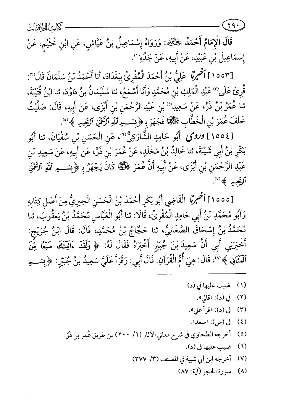 [1553] أخبرنا عَلِيُّ بْنُ أَحْمَدَ الْمُقْرِئُ بِبَغْدَادَ، أنا أَحْمَدُ بْنُ سَلْمَانَ قَالَ (¬2): قُرِئَ عَلَى (¬3) عَبْدِ الْمَلِكِ بْنِ مُحَمَّدٍ وَأَنَا أَسْمَعُ، ثنا سُلَيْمَانُ بْنُ دَاوُدَ، ثنا ابْنُ قُتَيْبَةَ، ثنا عُمَرُ بْنُ ذَرٍّ، عَنْ سَعِيدِ (¬4) بْنِ عَبْدِ الرَّحْمَنِ بْنِ أَبْزَى، عَنْ أَبِيهِ، قَالَ: صَلَّيْتُ خَلْفَ عُمَرَ بْنِ الْخَطَّابِ - رضي الله عنه - فَجَهَرَ بِـ {بِسْمِ اللَّهِ الرَّحْمَنِ الرَّحِيمِ} (¬5).