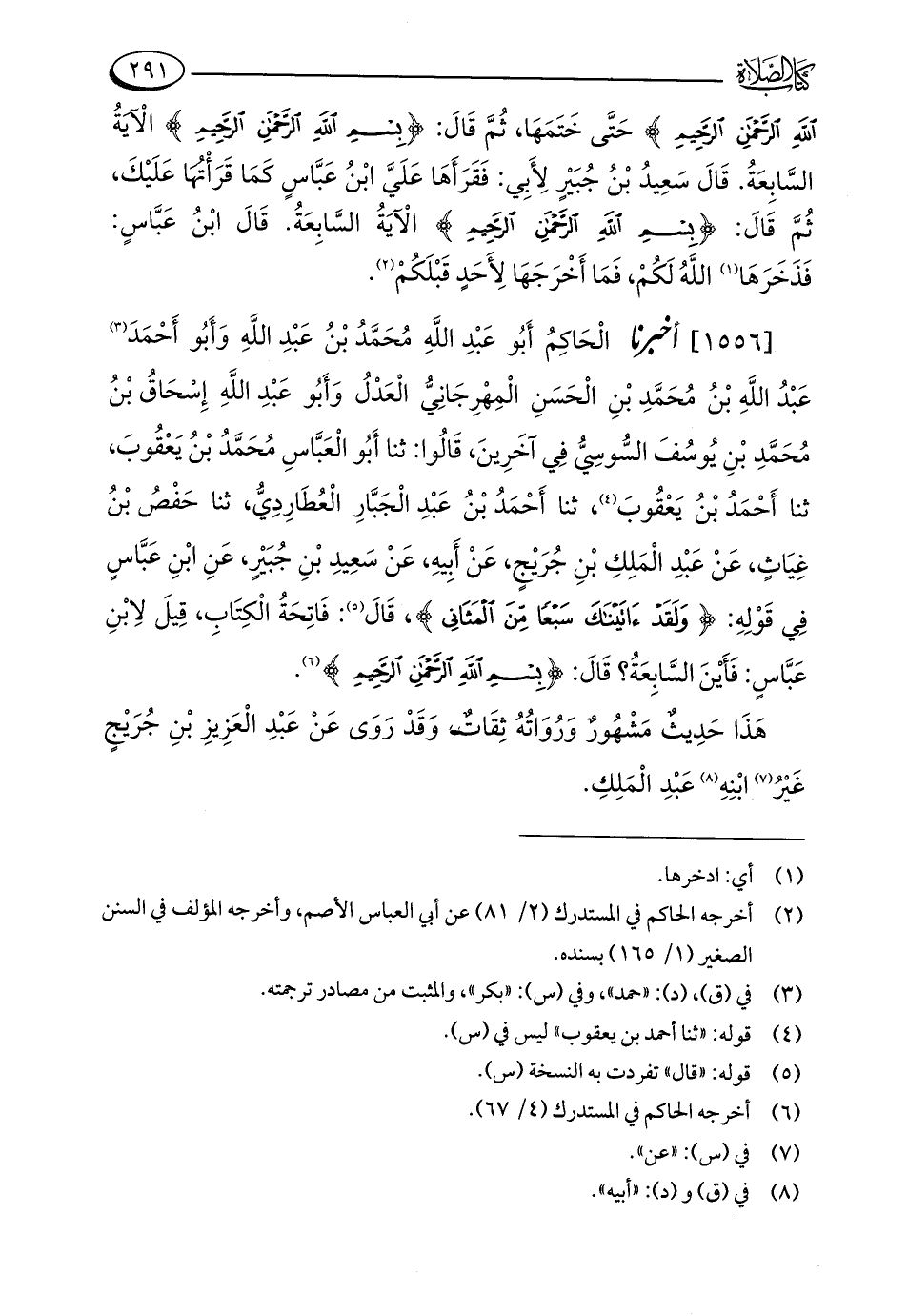 [1556] أخبرنا الْحَاكِمُ أَبُو عَبْدِ اللَّهِ مُحَمَّدُ بْنُ عَبْدِ اللَّهِ وَأَبُو أَحْمَدَ (¬3) عَبْدُ اللَّهِ بْنُ مُحَمَّدِ بْنِ الْحَسَنِ الْمِهْرِجَانِيُّ الْعَدْلُ وَأَبُو عَبْدِ اللَّهِ إِسْحَاقُ بْنُ مُحَمَّدِ بْنِ يُوسُفَ السُّوسِيُّ فِي آخَرِينَ، قَالُوا: ثنا أَبُو الْعَبَّاسِ مُحَمَّدُ بْنُ يَعْقُوبَ، ثنا أَحْمَدُ بْنُ يَعْقُوبَ (¬4)، ثنا أَحْمَدُ بْنُ عَبْدِ الْجَبَّارِ الْعُطَارِدِيُّ، ثنا حَفْصُ بْنُ غِيَاثٍ، عَنْ عَبْدِ الْمَلِكِ بْنِ جُرَيْجٍ، عَنْ أَبِيهِ، عَنْ سعِيدِ بْنِ جُبَيْرٍ، عَنِ ابْنِ عَبَّاسٍ فِي قَوْلِهِ: {وَلَقَدْ آتَيْنَاكَ سَبْعًا مِنَ الْمَثَانِي} قَالَ (¬5): فَاتِحَةُ الْكِتَابِ، قِيلَ لِابْنِ عَبَّاسٍ: فَأَيْنَ السَّابِعَةُ؟ قَالَ: {بِسْمِ اللَّهِ الرَّحْمَنِ الرَّحِيمِ} (¬6).