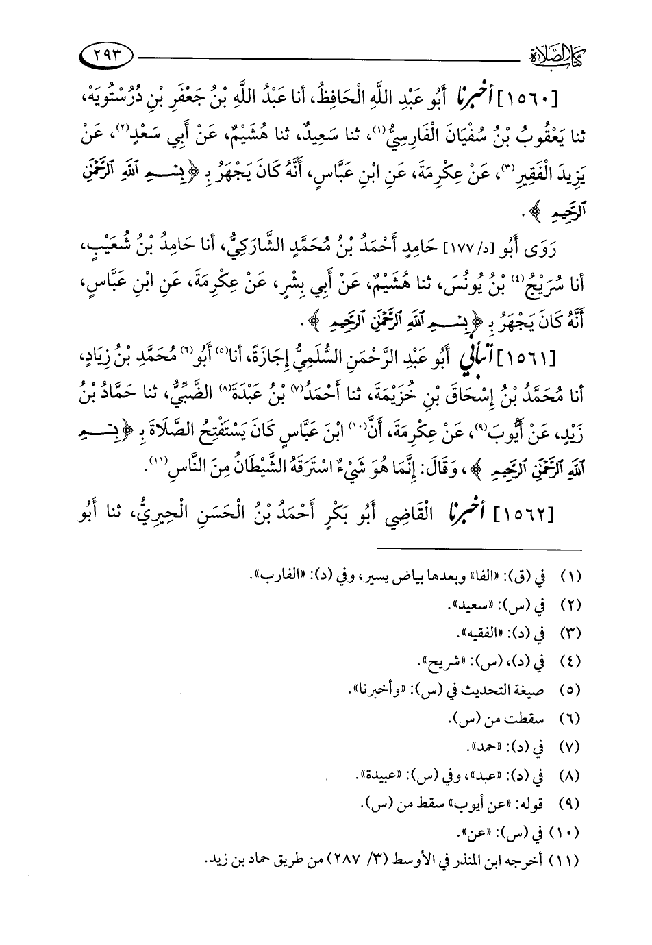 [1561] أنبأني أَبُو عَبْدِ الرَّحْمَنِ السُّلَمِيُّ إِجَازَةً، أنا (¬5) أَبُو (¬6) مُحَمَّدِ بْنُ زِيادٍ، أنا مُحَمَّدُ بْنُ إِسْحَاقَ بْنِ خُزَيْمَةَ، ثنا أَحْمَدُ (¬7) بْنُ عَبْدَةَ (¬8) الضَّبِّيُّ، ثنا حَمَّادُ بْنُ زَيْدٍ، عَنْ أَيُّوبَ (¬9)، عَنْ عِكْرِمَةَ، أَنَّ (¬10) ابْنَ عَبَّاسٍ كَانَ يَسْتَفْتِحُ الصَّلَاةَ بِـ {بِسْمِ اللَّهِ الرَّحْمَنِ الرَّحِيمِ}، وَقَالَ: إِنَّمَا هُوَ شَيْءٌ اسْتَرَقَهُ الشَّيْطَانُ مِنَ النَّاسِ (¬11).