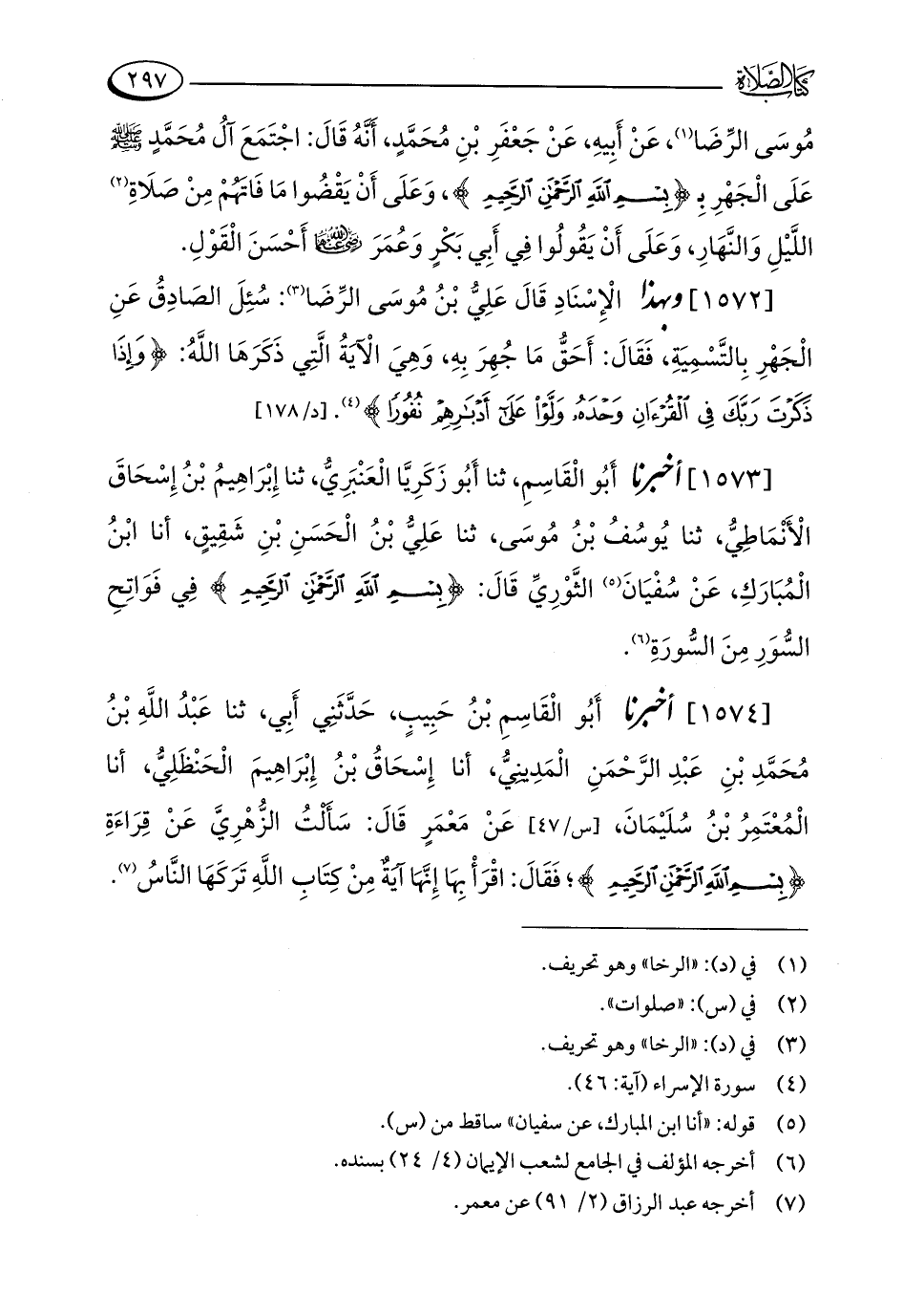 [1573] أخبرنا أَبُو الْقَاسِمِ، ثنا أَبُو زَكَرِيَّا الْعَنْبَرِيُّ، ثنا إِبْرَاهِيمُ بْنُ إِسْحَاقَ الْأَنْمَاطِيُّ، ثنا يُوسُفُ بْنُ مُوسَى، ثنا عَلِيُّ بْنُ الْحَسَنِ بْنِ شَقِيقٍ، أنا ابْنُ الْمُبَارَكِ، عَنْ سُفْيَانَ (¬5) الثَّوْرِيِّ قَالَ: {بِسْمِ اللَّهِ الرَّحْمَنِ الرَّحِيمِ} فِي فَوَاتِحِ السُّوَرِ مِنَ السُّورَةِ (¬6).