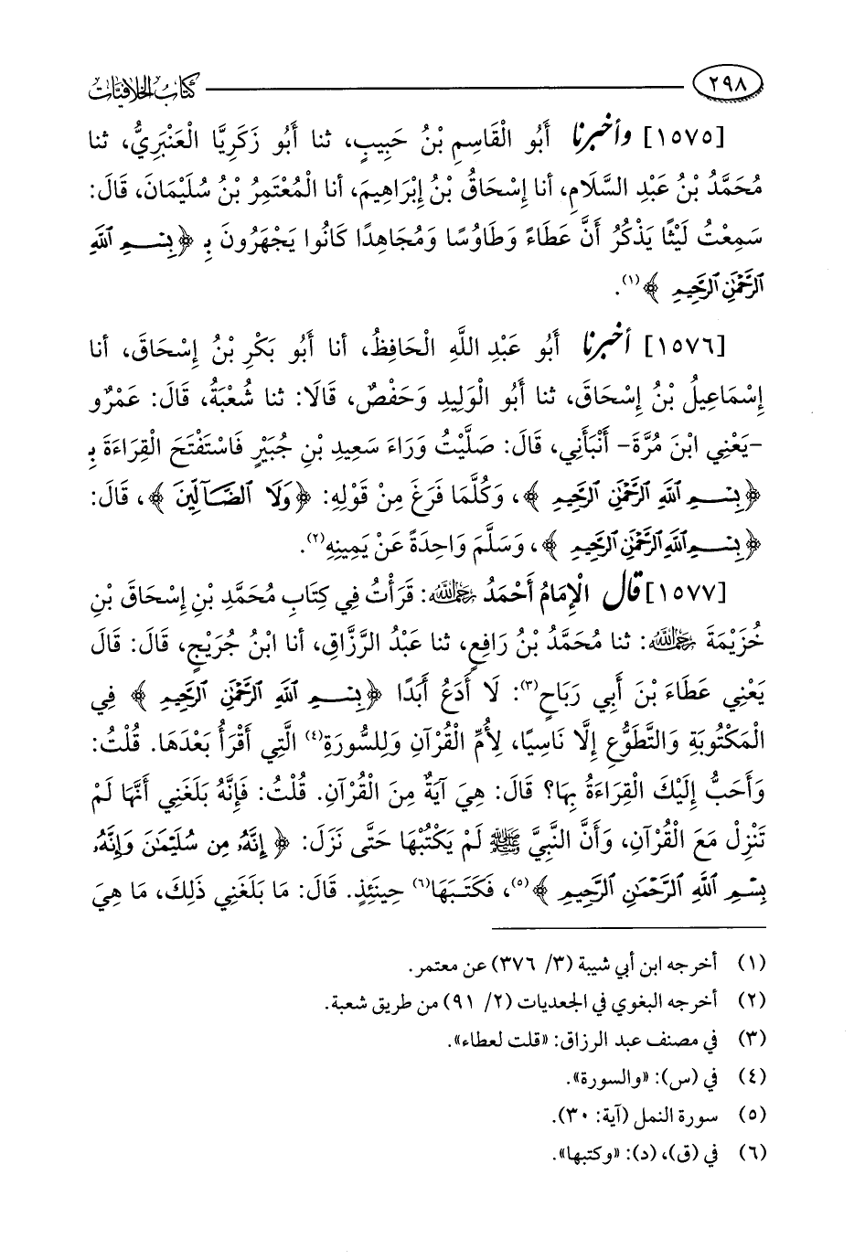 [1577] قال الْإِمَامُ أَحْمَدُ - رحمه الله -: قَرَأْتُ فِي كِتَابِ مُحَمَّدِ بْنِ إِسْحَاقَ بْنِ خُزَيْمَةَ - رحمه الله -: ثنا مُحَمَّدُ بْنُ رَافِعٍ، ثنا عَبْدُ الرَّزَّاقِ، أنا ابْنُ جُرَيْجٍ، قَالَ: قَالَ يَعْنِي عَطَاءَ بْنَ أبِي رَبَاحٍ (¬3): لَا أَدَعُ أَبَدًا {بِسْمِ اللَّهِ الرَّحْمَنِ الرَّحِيمِ} فِي الْمَكْتُوبَةِ وَالتَّطَوُّعِ إِلَّا نَاسِيًا، لِأُمِّ الْقُرآنِ وَلِلسُّورَةِ (¬4) الَّتِي أَقْرَأُ بَعْدَهَا. قُلْتُ: وَأَحَبُّ إِلَيْكَ الْقِرَاءَةُ بِهَا؟ قَالَ: هِيَ آيَةٌ مِنَ الْقُرْآنِ. قُلْتُ: فَإِنَّهُ بَلَغَنِي أَنَّهَا لَمْ تَنْزِلْ مَعَ الْقُرْآنِ، وَأَنَّ النَّبِيَّ - صلى الله عليه وسلم - لَمْ يَكْتُبْهَا حَتَّى نَزَلَ: {إِنَّهُ مِنْ سُلَيْمَانَ وَإِنَّهُ بِسْمِ اللَّهِ الرَّحْمَنِ الرَّحِيمِ} (¬5)، فَكَتَبَهَا (¬6) حِينَئِذٍ. قَالَ: مَا بَلَغَنِي ذَلِكَ، مَا هِيَ