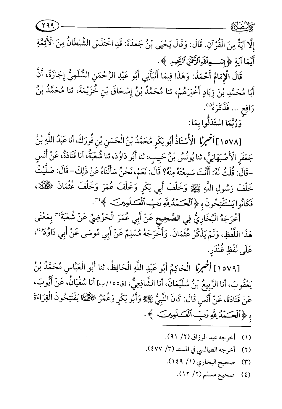 [1578] أخبرنا الْأُسْتَاذُ أَبُو بَكْرٍ مُحَمَّدُ بْنُ الْحَسَنِ بْنِ فُورَكَ، أنا عَبْدُ اللَّهِ بْنُ جَعْفَرٍ الْأَصْبَهَانِيُّ، ثنا يُونُسُ بْنُ حَبِيبٍ، ثنا أَبُو دَاوُدَ، ثنا شُعْبَةُ، أنا قَتَادَةُ، عَنْ أَنسٍ - قَالَ: قُلْتُ لَهُ: أَأَنْتَ سَمِعْتَهُ مِنْهُ؟ قَالَ: نَعَمْ، نَحْنُ سَأَلْنَاهُ عَنْ ذَلِكَ - قَالَ: صَلَّيْتُ خَلْفَ رَسُولِ اللَّهِ - صلى الله عليه وسلم - وَخَلْفَ أَبِي بَكْرٍ وَخَلْفَ عُمَرَ وَخَلْفَ عُثْمَانَ - رضي الله عنهم -، فَكَانُوا يَسْتَفْتِحُونَ بِـ {الْحَمْدُ لِلَّهِ رَبِّ الْعَالَمِينَ} (¬2).