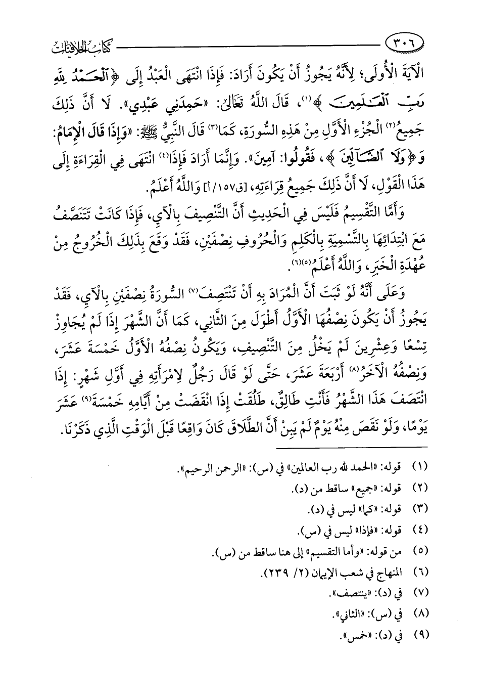 وَعَلَى أَنَّهُ لَوْ ثَبَتَ أَنَّ الْمُرَادَ بِهِ أَنْ تَنْتَصِفَ (¬7) السُّورَةُ نِصْفَيْنِ بِالْآيِ، فَقَدْ يَجُوزُ أَنْ يَكُونَ نِصْفُهَا الْأَوَّلُ أَطْوَلَ مِنَ الثَّانِي، كَمَا أَنَّ الشَّهْرَ إِذَا لَمْ يُجَاوِزْ تِسْعًا وَعِشْرِينَ لَمْ يَخْلُ مِنَ التَّنْصِيفِ، وَيَكُونُ نِصْفُهُ الْأَوَّلُ خَمْسَةَ عَشَرَ، وَنِصْفُهُ الْآخَرُ (¬8) أَرْبَعَةَ عَشَرَ، حَتَّى لَوْ قَالَ رَجُلٌ لِامْرَأَتِهِ فِي أَوَّلِ شَهْرٍ: إِذَا انْتَصَفَ هَذَا الشَّهْرُ فَأَنْتِ طَالِقٌ، طَلُقَتْ إِذَا انْقَضَتْ مِنْ أيَّامِهِ خَمْسَةَ (¬9) عَشَرَ يَوْمًا، وَلَوْ نَقَصَ مِنْهُ يَوْمٌ لَمْ يَبِنْ أَنَّ الطَّلَاقَ كَانَ وَاقِعًا قَبْلَ الْوَقْتِ الَّذِي ذَكَرْنَا.