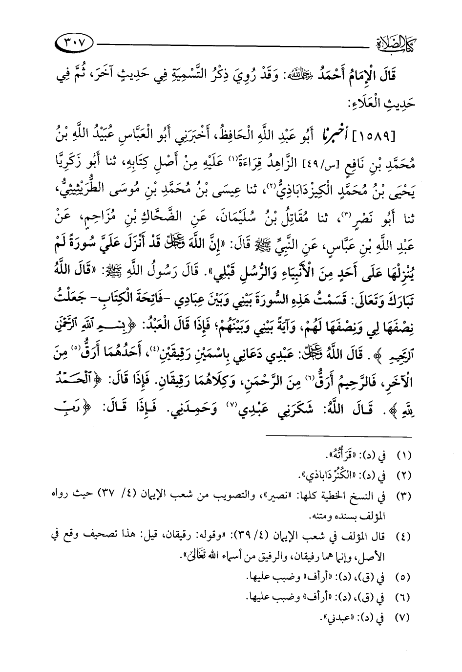 [1589] أخبرنا أَبُو عَبْدِ اللَّهِ الْحَافِظُ، أَخْبَرَنِي أَبُو الْعَبَّاسِ عُبَيْدُ اللَّهِ بْنُ مُحَمَّدِ بْنِ نَافِعٍ الزَّاهِدُ قِرَاءَةً (¬1) عَلَيْهِ مِنْ أَصْلِ كِتَابِهِ، ثنا أَبُو زَكَرِيَّا يَحْيَى بْنُ مُحَمَّدٍ الْكِيزْدَابَاذِيُّ (¬2)، ثنا عِيسَى بْنُ مُحَمَّدِ بْنِ مُوسَى الطُّرَيْثِيثِيُّ، ثنا أَبُو نَصْرٍ (¬3)، ثنا مُقَاتِلُ بْنُ سُلَيْمَانَ، عَنِ الضَّحَّاكِ بْنِ مُزَاحِمٍ، عَنْ عَبْدِ اللَّهِ بْنِ عَبَّاسٍ، عَنِ النَّبِيِّ - صلى الله عليه وسلم - قَالَ: "إِنَّ اللَّهَ - عز وجل - قَدْ أنزَلَ عَلَيَّ سُورَةً لَمْ يُنْزِلْهَا عَلَى أَحَدٍ مِنَ الْأَنْبِيَاءِ وَالرُّسُلِ قَبْلِي". قَالَ رَسُولُ اللَّهِ - صلى الله عليه وسلم -: "قَالَ اللَّهُ تَبَارَكَ وَتَعَالَى: قَسَمْتُ هَذِهِ السُّورَةَ بَيْنِي وَبَيْنَ عِبَادِي - فَاتِحَةَ الْكِتَابِ - جَعَلْتُ نِصْفَهَا لِي وَنِصْفَهَا لَهُمْ، وَآيَةً بَيْنِي وَبَيْنَهُمْ؛ فَإِذَا قَالَ الْعَبْدُ: {بِسْمِ اللَّهِ الرَّحْمَنِ الرَّحِيمِ}. قَالَ اللَّهُ - عز وجل -: عَبْدِي دَعَانِي بِاسْمَيْنِ رَقِيقَيْنِ (¬4)، أَحَدُهُمَا أَرَقُّ (¬5) مِنَ الْآخَرِ، فَالرَّحِيمُ أَرَقُّ (¬6) مِنَ الرَّحْمَنِ، وَكِلَاهُمَا رَقِيقَانِ. فَإِذَا قَالَ: {الْحَمْدُ لِلَّهِ}. قَالَ اللَّهُ: شَكَرَنِي عَبْدِي (¬7) وَحَمِدَنِي. فَإِذَا قَالَ: {رَبِّ