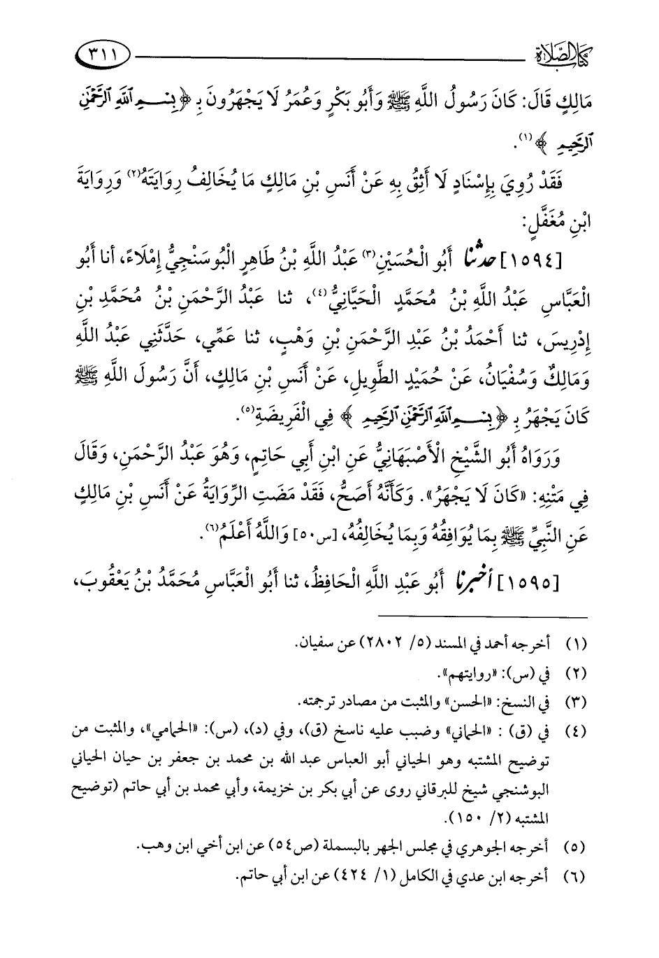 [1594] حدثنا أَبُو الْحُسَيْنِ (¬3) عَبْدُ اللَّهِ بْنُ طَاهِرٍ الْبُوسَنْجِيُّ إِمْلَاءً، أنا أَبُو الْعَبَّاسِ عَبْدُ اللَّهِ بْنُ مُحَمَّدٍ الْحَيَّانِيُّ (¬4)، ثنا عَبْدُ الرَّحْمَنِ بْنُ مُحَمَّدِ بْنِ إِدْرِيسَ، ثنا أَحْمَدُ بْنُ عَبْدِ الرَّحْمَنِ بْنِ وَهْبٍ، ثنا عَمِّي، حَدَّثَنِي عَبْدُ اللَّهِ وَمَالِكٌ وَسُفْيَانُ، عَنْ حُمَيْدٍ الطَّوِيلِ، عَنْ أَنَسِ بْنِ مَالِكٍ، أَنَّ رَسُولَ اللَّهِ - صلى الله عليه وسلم - كَانَ يَجْهَرُ بِـ {بِسْمِ اللَّهِ الرَّحْمَنِ الرَّحِيمِ} فِي الْفَرِيضَةِ (¬5).