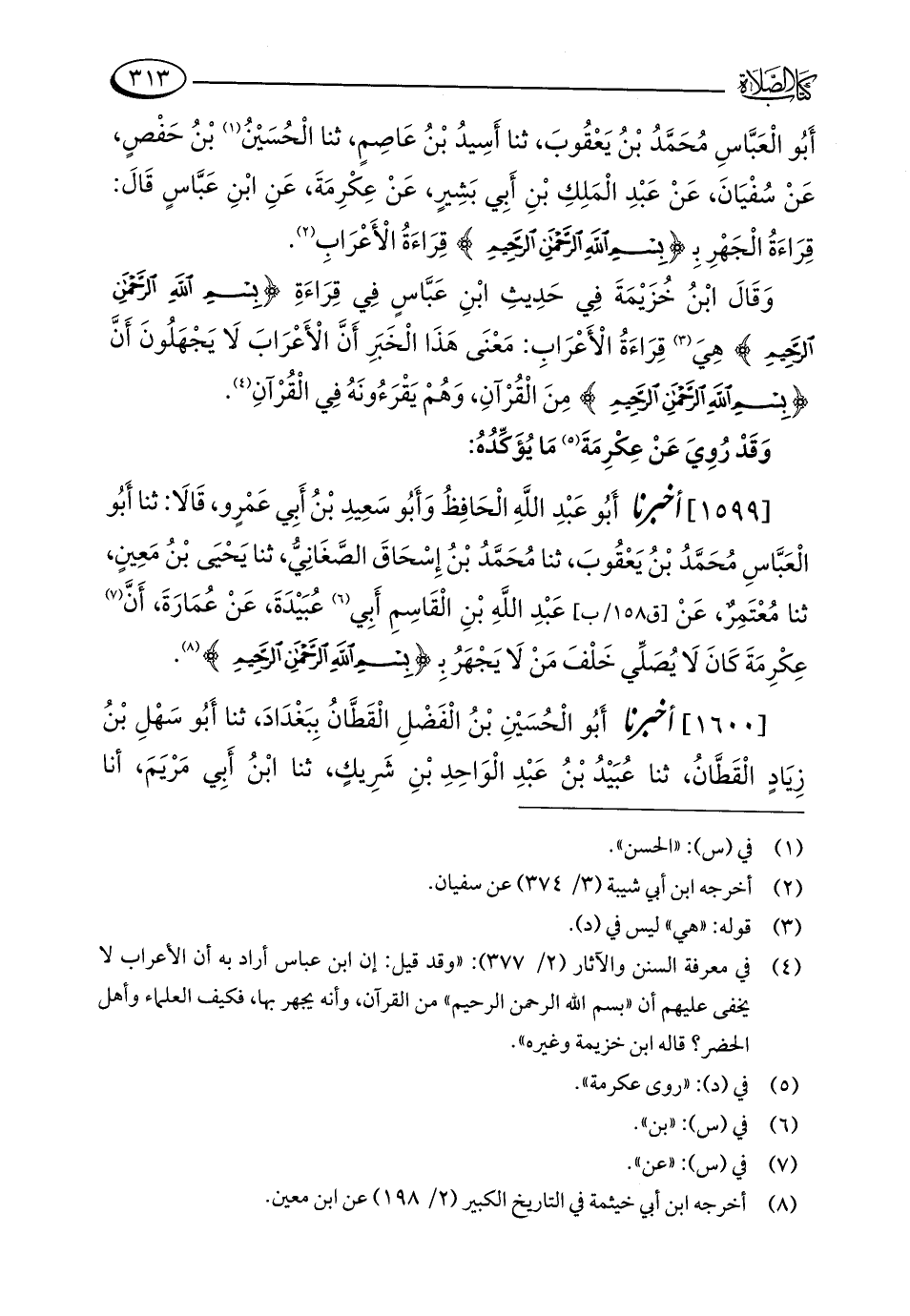 [1599] أخبرنا أَبُو عَبْدِ اللَّهِ الْحَافِظُ وَأَبُو سَعِيدِ بْنُ أَبِي عَمْرٍو، قَالَا: ثنا أَبُو الْعَبَّاسِ مُحَمَّدُ بْنُ يَعْقُوبَ، ثنا مُحَمَّدُ بْنُ إِسْحَاقَ الصَّغَانِيُّ، ثنا يَحْيَى بْنُ مَعِينٍ، ثنا مُعْتَمِرٌ، عَنْ عَبْدِ اللَّهِ بْنِ الْقَاسِمِ أَبِي (¬6) عُبَيْدَةَ، عَنْ عُمَارَةَ، أَنَّ (¬7) عِكْرِمَةَ كَانَ لَا يُصَلِّي خَلْفَ مَنْ لَا يَجْهَرُ بِـ {بِسْمِ اللَّهِ الرَّحْمَنِ الرَّحِيمِ} (¬8).