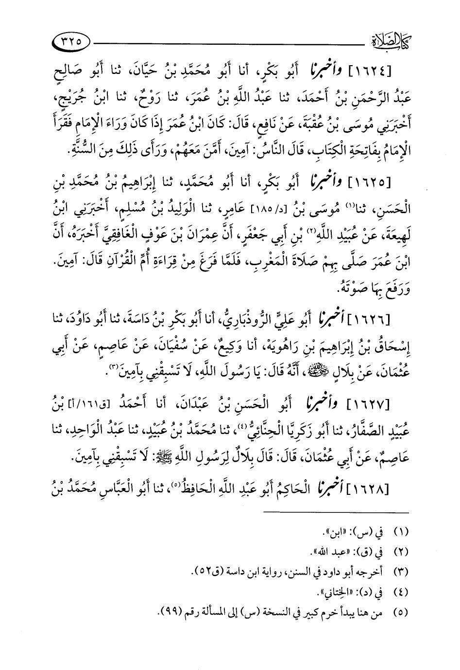 [1626] أخبرنا أَبُو عَلِيٍّ الرُّوذْبَارِيُّ، أنا أَبُو بَكْرِ بْنُ دَاسَةَ، ثنا أَبُو دَاوُدَ، ثنا إِسْحَاقُ بْنُ إِبْرَاهِيمَ بْنِ رَاهُويَهْ، أنا وَكِيعٌ، عَنْ سُفْيَانَ، عَنْ عَاصِمٍ، عَنْ أَبِي عُثْمَانَ، عَنْ بِلَالٍ - رضي الله عنه -، أَنَّهُ قَالَ: يَا رَسُولَ اللَّهِ، لَا تَسْبِقْنِي بِآمِينَ (¬3).