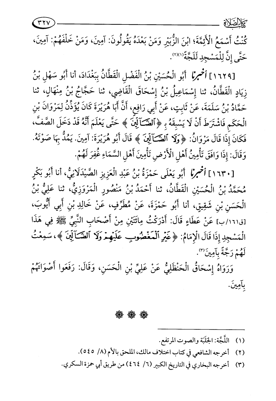[1630] أخبرنا أَبُو يَعْلَى حَمْزَةُ بْنُ عَبْدِ الْعَزِيزِ الصَّيْدَلَانِيُّ، أنا أَبُو بَكْرٍ مُحَمَّدُ بْنُ الْحُسَيْنِ الْقَطَّانُ، ثنا أَحْمَدُ بْنُ مَنْصُورٍ الْمَرْوَزِيُّ، ثنا عَلِيُّ بْنُ الْحَسَنِ بْنِ شَقِيقٍ، أنا أَبُو حَمْزَةَ، عَنْ مُطَرِّفٍ، عَنْ خَالِدِ بْنِ أَبِي أَيُّوبَ، عَنْ عَطَاءٍ قَالَ: أَدْرَكْتُ مِائَتَيْنِ مِنْ أَصْحَابِ النَّبِيِّ - صلى الله عليه وسلم - فِي هَذَا الْمَسْجِدِ إِذَا قَالَ الْإِمَامُ: {غَيْرِ الْمَغْضُوبِ عَلَيْهِمْ وَلَا الضَّالِّينَ}، سَمِعْتُ لَهُمْ رَجَّةً بِآمِينَ (¬3).