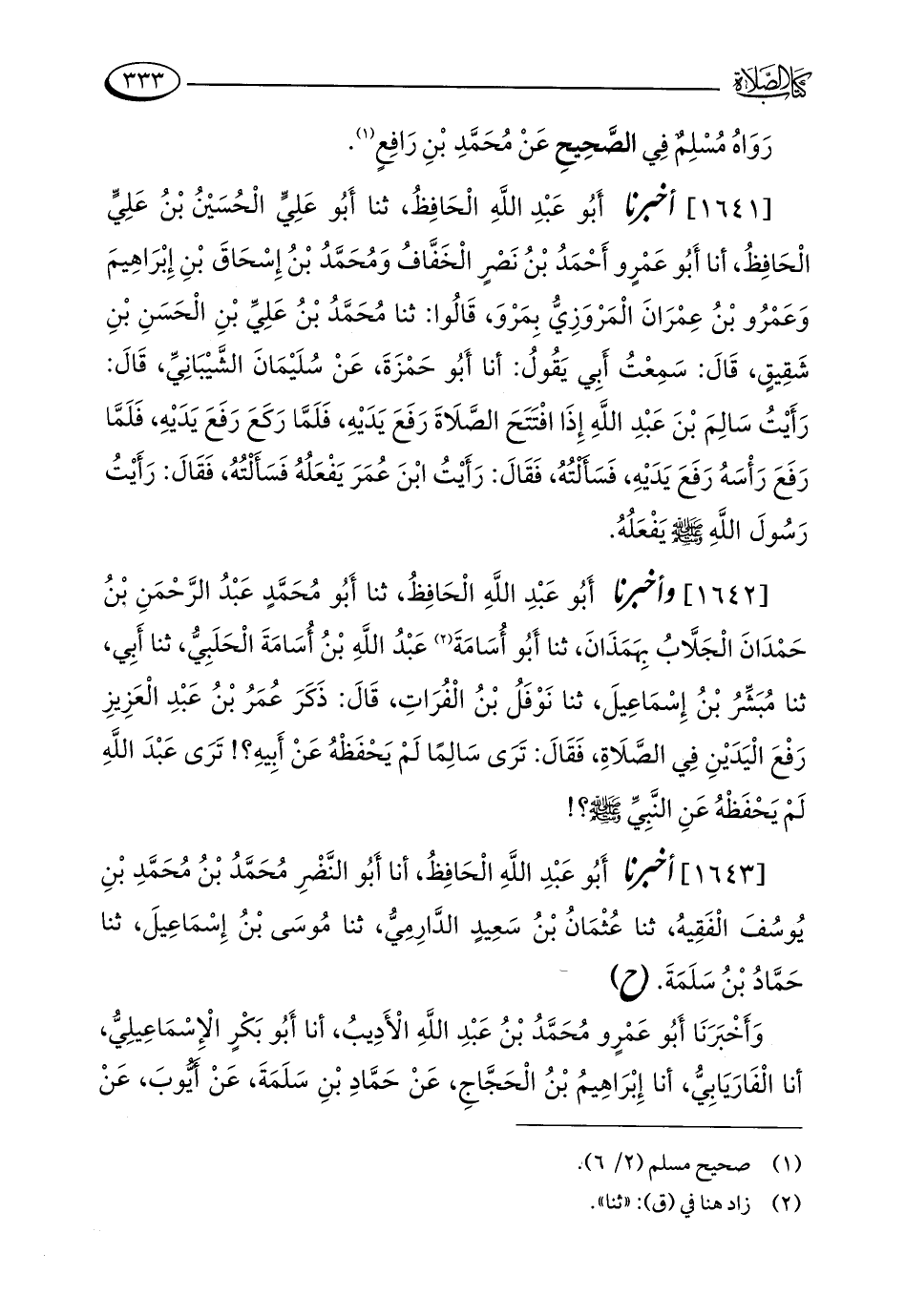 [1641] أخبرنا أَبُو عَبْدِ اللَّهِ الْحَافِظُ، ثنا أَبُو عَلِيٍّ الْحُسَيْنُ بْنُ عَلِيٍّ الْحَافِظُ، أنا أَبُو عَمْرٍو أَحْمَدُ بْنُ نَصْرٍ الْخَفَّافُ وَمُحَمَّدُ بْنُ إِسْحَاقَ بْنِ إِبْرَاهِيمَ وَعَمْرُو بْنُ عِمْرَانَ الْمَرْوَزِيُّ بِمَرْوَ، قَالُوا: ثنا مُحَمَّدُ بْنُ عَلِيِّ بْنِ الْحَسَنِ بْنِ شَقِيقٍ، قَالَ: سَمِعْتُ أَبِي يَقُولُ: أنا أَبُو حَمْزَةَ، عَنْ سُلَيْمَانَ الشَّيْبَانِيِّ، قَالَ: رَأَيْتُ سَالِمَ بْنَ عَبْدِ اللَّهِ إِذَا افْتَتَحَ الصَّلَاةَ رَفَعَ يَدَيْهِ، فَلَمَّا رَكَعَ رَفَعَ يَدَيْهِ، فَلَمَّا رَفَعَ رَأْسَهُ رَفَعَ يَدَيْهِ، فَسَأَلْتُهُ، فَقَالَ: رَأَيْتُ ابْنَ عُمَرَ يَفْعَلُهُ فَسَأَلْتُهُ، فَقَالَ: رَأَيْتُ رَسُولَ اللَّهِ - صلى الله عليه وسلم - يَفْعَلُهُ.