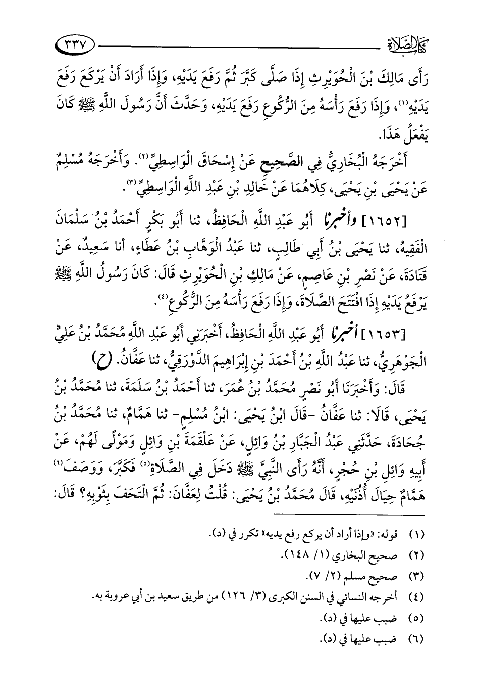 [1652] وأخبرنا أَبُو عَبْدِ اللَّهِ الْحَافِظُ، ثنا أَبُو بَكْرٍ أَحْمَدُ بْنُ سَلْمَانَ الْفَقِيهُ، ثنا يَحْيَى بْنُ أَبِي طَالِبٍ، ثنا عَبْدُ الْوَهَّابِ بْنُ عَطَاءٍ، أنا سَعِيدٌ، عَنْ قَتَادَةَ، عَنْ نَصْرِ بْنِ عَاصِمٍ، عَنْ مَالِكِ بْنِ الْحُوَيْرِثِ قَالَ: كَانَ رَسُولُ اللَّهِ - صلى الله عليه وسلم - يَرْفَعُ يَدَيْهِ إِذَا افْتَتَحَ الصَّلَاةَ، وَإِذَا رَفَعَ رَأْسَهُ مِنَ الرُّكُوعِ (¬4).