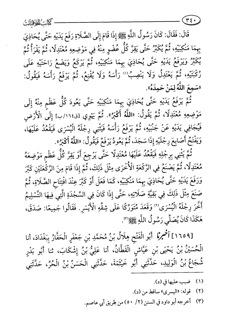 ثُمَّ يَثْنِي بِرِجْلِهِ فَيَقْعُدُ عَلَيْهَا مُعْتَدِلًا حَتَّى يَرْجِعَ أَوْ يَقِرَّ كُلُّ عَظْمٍ مَوْضِعَهُ مُعْتَدِلًا، ثُمَّ يَصْنَعُ فِي الرَّكْعَةِ الْأُخْرَى مِثْلَ ذَلِكَ، ثُمَّ إِذَا قَامَ مِنَ الرَّكْعَتَيْنِ كَبَّرَ وَرَفَعَ يَدَيْهِ حَتَّى يُحَاذِيَ بِهِمَا مَنْكِبَيْهِ، كَمَا فَعَلَ أَوْ كَبَّرَ عِنْدَ افْتِتَاحِ الصَّلَاةِ، ثُمَّ صَنَعَ مِثْلَ ذَلِكَ فِي بَقِيَّةِ صَلَاتِهِ، حَتَّى إِذَا كَانَ فِي السَّجْدَةِ الَّتِي فِيهَا التَّسْلِيمُ أَخَّرَ رِجْلَهُ الْيُسْرَى (¬2) وَقَعَدَ مُتَوَرِّكًا عَلَى شِقِّهِ الْأَيْسَرِ. فَقَالُوا جَمِيعًا: صَدَقَ، هَكَذَا كَانَ يُصَلِّي رَسُولُ اللَّهِ - صلى الله عليه وسلم - (¬3).