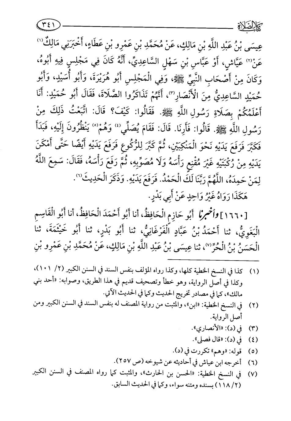 عِيسَى بْنُ عَبْدِ اللَّهِ بْنِ مَالِكٍ، عَنْ مُحَمَّدِ بْنِ عَمْرِو بْنِ عَطَاءٍ، أَخْبَرَنِي مَالِكٌ (¬1) عَنْ (¬2) عَيَّاشٍ، أَوْ عَبَّاسِ بْنِ سَهْلٍ السَّاعِدِيِّ، أَنَّهُ كَانَ فِي مَجْلِسٍ فِيهِ أَبُوهُ، وَكَانَ مِنْ أَصْحَابِ النَّبِيِّ - صلى الله عليه وسلم -، وَفِي الْمَجْلِسِ أَبُو هُرَيْرَةَ، وَأَبُو أُسَيْدٍ، وَأَبُو حُمَيْدٍ السَّاعِدِيُّ مِنَ الْأَنْصَارِ (¬3)، أَنَّهُمْ تَذَاكَرُوا الصَّلَاةَ، فَقَالَ أَبُو حُمَيْدٍ: أَنَا أَعْلَمُكُمْ بِصَلَاةِ رَسُولِ اللَّهِ - صلى الله عليه وسلم -. فَقَالُوا: كَيْفَ؟ قَالَ: اتَّبَعْتُ ذَلِكَ مِنْ رَسُولِ اللَّهِ - صلى الله عليه وسلم -. قَالُوا: فَأَرِنَا. قَالَ: فَقَامَ يُصَلِّي (¬4) وَهُمْ (¬5) يَنْظُرُونَ إِلَيْهِ، فَبَدَأَ فَكَبَّرَ فَرَفَعَ يَدَيْهِ نَحْوَ الْمَنْكِبَيْنِ، ثُمَّ كَبَّرَ لِلرُّكُوعِ فَرَفَعَ يَدَيْهِ أَيْضًا حَتَّى أَمْكَنَ يَدَيْهِ مِنْ رُكْبَتَيْهِ غَيْرَ مُقنِعٍ رَأْسَهُ وَلَا مُصَوِّبِهِ، ثُمَّ رَفَعَ رَأْسَهُ، فَقَالَ: سَمِعَ اللَّهُ لِمَنْ حَمِدَهُ، اللَّهُمَّ رَبَّنَا لَكَ الْحَمْدُ. فَرَفَعَ يَدَيْهِ. وَذَكَرَ الْحَدِيثَ (¬6).