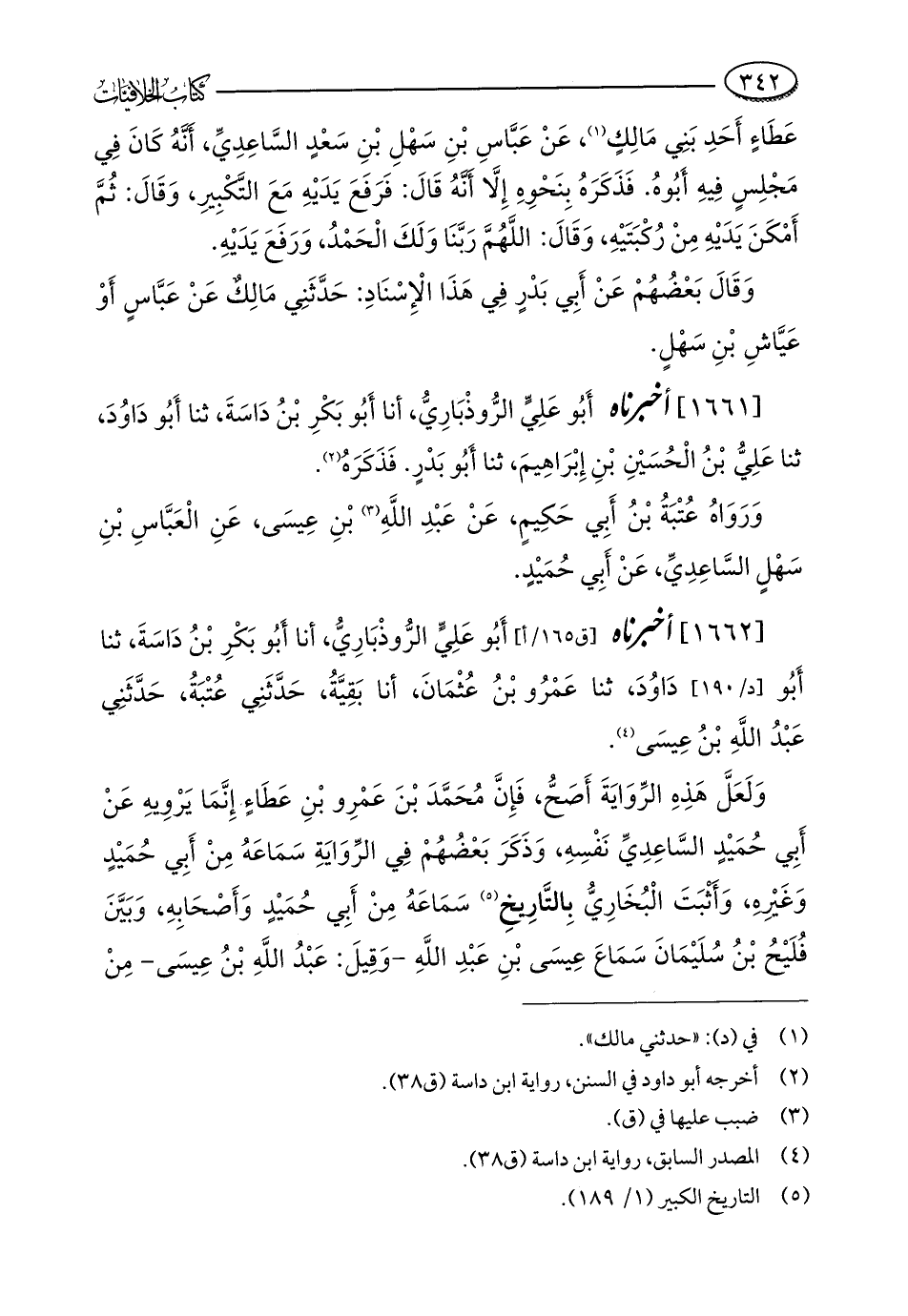 وَلَعَلَّ هَذِهِ الرِّوَايَةَ أَصَحُّ، فَإِنَّ مُحَمَّدَ بْنَ عَمْرِو بْنِ عَطَاءٍ إِنَّمَا يَرْوِيهِ عَنْ أَبِي حُمَيْدٍ السَّاعِدِيِّ نَفْسِهِ، وَذَكَرَ بَعْضُهُمْ فِي الرِّوَايَةِ سَمَاعَهُ مِنْ أَبِي حُمَيْدٍ وَغَيْرِهِ، وَأَثْبَتَ الْبُخَارِيُّ بِالتَّارِيخِ (¬5) سَمَاعَهُ مِنْ أَبِي حُمَيْدٍ وَأَصْحَابِهِ، وَبَيَّنَ فُلَيْحُ بْنُ سُلَيْمَانَ سَمَاعَ عِيسَى بْنِ عَبْدِ اللَّهِ - وَقِيلَ: عَبْدُ اللَّهِ بْنُ عِيسَى - مِنْ