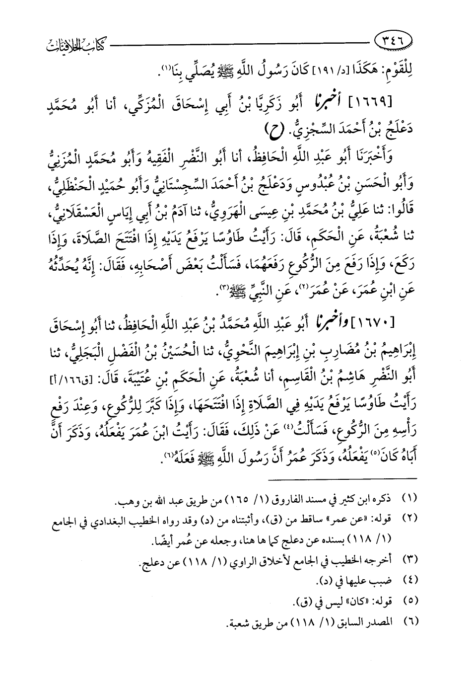 [1670] وأخبرنا أَبُو عَبْدِ اللَّهِ مُحَمَّدُ بْنُ عَبْدِ اللَّهِ الْحَافِظُ، ثنا أَبُو إِسْحَاقَ إِبْرَاهِيمُ بْنُ مُضَارِبِ بْنِ إِبْرَاهِيمَ النَّحْوِيُّ، ثنا الْحُسَيْنُ بْنُ الْفَضْلِ الْبَجَلِيُّ، ثنا أَبُو النَّضْرِ هَاشِمُ بْنُ الْقَاسِمِ، أنا شُعْبَةُ، عَنِ الْحَكَمِ بْنِ عُتَيْبَةَ، قَالَ: رَأَيْتُ طَاوُسًا يَرْفَعُ يَدَيْهِ فِي الصَّلَاةِ إِذَا افْتَتَحَهَا، وَإِذَا كَبَّرَ لِلرُّكُوعِ، وَعِنْدَ رَفْعِ رَأْسِهِ مِنَ الرُّكُوعِ، فَسَأَلْتُ (¬4) عَنْ ذَلِكَ، فَقَالَ: رَأَيْتُ ابْنَ عُمَرَ يَفْعَلُهُ، وَذَكَرَ أَنَّ أَبَاهُ كَانَ (¬5) يَفْعَلُهُ، وَذَكَرَ عُمَرُ أَنَّ رَسُولَ اللَّهِ - صلى الله عليه وسلم - فَعَلَهُ (¬6).