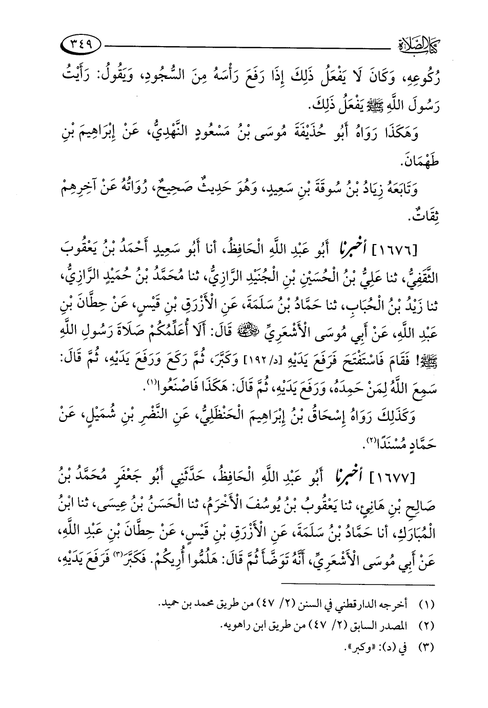 [1676] أخبرنا أَبُو عَبْدِ اللَّهِ الْحَافِظُ، أنا أَبُو سَعِيدٍ أَحْمَدُ بْنُ يَعْقُوبَ الثَّقَفِيُّ، ثنا عَلِيُّ بْنُ الْحُسَيْنِ بْنِ الْجُنَيْدِ الرَّازِيُّ، ثنا مُحَمَّدُ بْنُ حُمَيْدٍ الرَّازِيُّ، ثنا زَيْدُ بْنُ الْحُبَابِ، ثنا حَمَّادُ بْنُ سَلَمَةَ، عَنِ الْأَزْرَقِ بْنِ قَيْسٍ، عَنْ حِطَّانَ بْنِ عَبْدِ اللَّهِ، عَنْ أَبِي مُوسَى الْأَشْعَرِيِّ - رضي الله عنه - قَالَ: ألا أُعَلِّمُكُمْ صَلَاةَ رَسُولِ اللَّهِ - صلى الله عليه وسلم -! فَقَامَ فَاسْتَفْتَحَ فَرَفَعَ يَدَيْهِ وَكَبَّرَ، ثُمَّ رَكَعَ وَرَفَعَ يَدَيْهِ، ثُمَّ قَالَ: سَمِعَ اللَّهُ لِمَنْ حَمِدَهُ، وَرَفَعَ يَدَيْهِ، ثُمَّ قَالَ: هَكَذَا فَاصْنَعُوا (¬1).