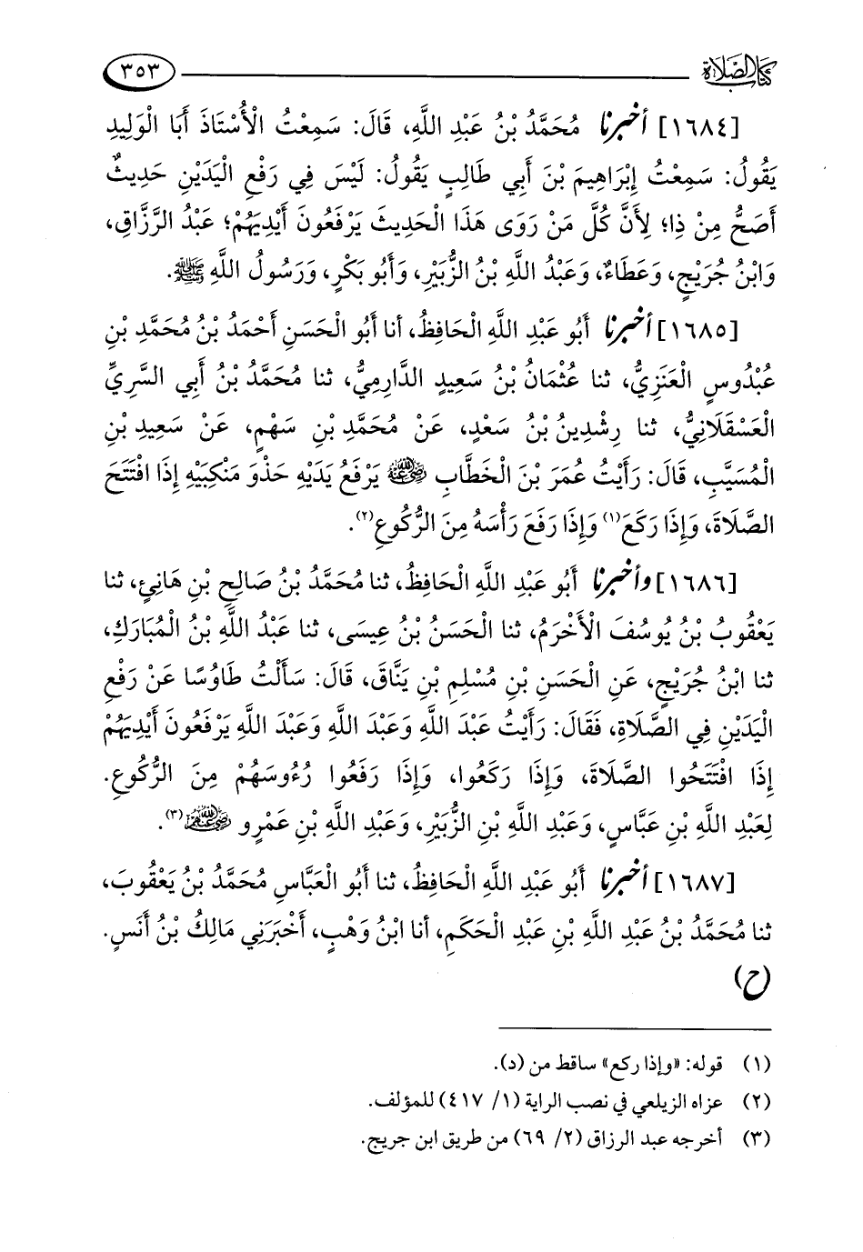 [1686] وأخبرنا أَبُو عَبْدِ اللَّهِ الْحَافِظُ، ثنا مُحَمَّدُ بْنُ صَالِحِ بْنِ هَانِئٍ، ثنا يَعْقُوبُ بْنُ يُوسُفَ الْأَخْرَمُ، ثنا الْحَسَنُ بْنُ عِيسَى، ثنا عَبْدُ اللَّهِ بْنُ الْمُبَارَكِ، ثنا ابْنُ جُرَيْجٍ، عَنِ الْحَسَنِ بْنِ مُسْلِمِ بْنِ يَنَّاقَ، قَالَ: سَأَلْتُ طَاوُسًا عَنْ رَفْعِ الْيَدَيْنِ فِي الصَّلَاةِ، فَقَالَ: رَأَيْتُ عَبْدَ اللَّهِ وَعَبْدَ اللَّهِ وَعَبْدَ اللَّهِ يَرْفَعُونَ أَيْدِيَهُمْ إِذَا افْتَتَحُوا الصَّلَاةَ، وَإِذَا رَكَعُوا، وَإِذَا رَفَعُوا رُءُوسَهُمْ مِنَ الرُّكُوعِ. لِعَبْدِ اللَّهِ بْنِ عَبَّاسٍ، وَعَبْدِ اللَّهِ بْنِ الزُّبَيْرِ، وَعَبْدِ اللَّهِ بْنِ عَمرٍو - رضي الله عنهم - (¬3).