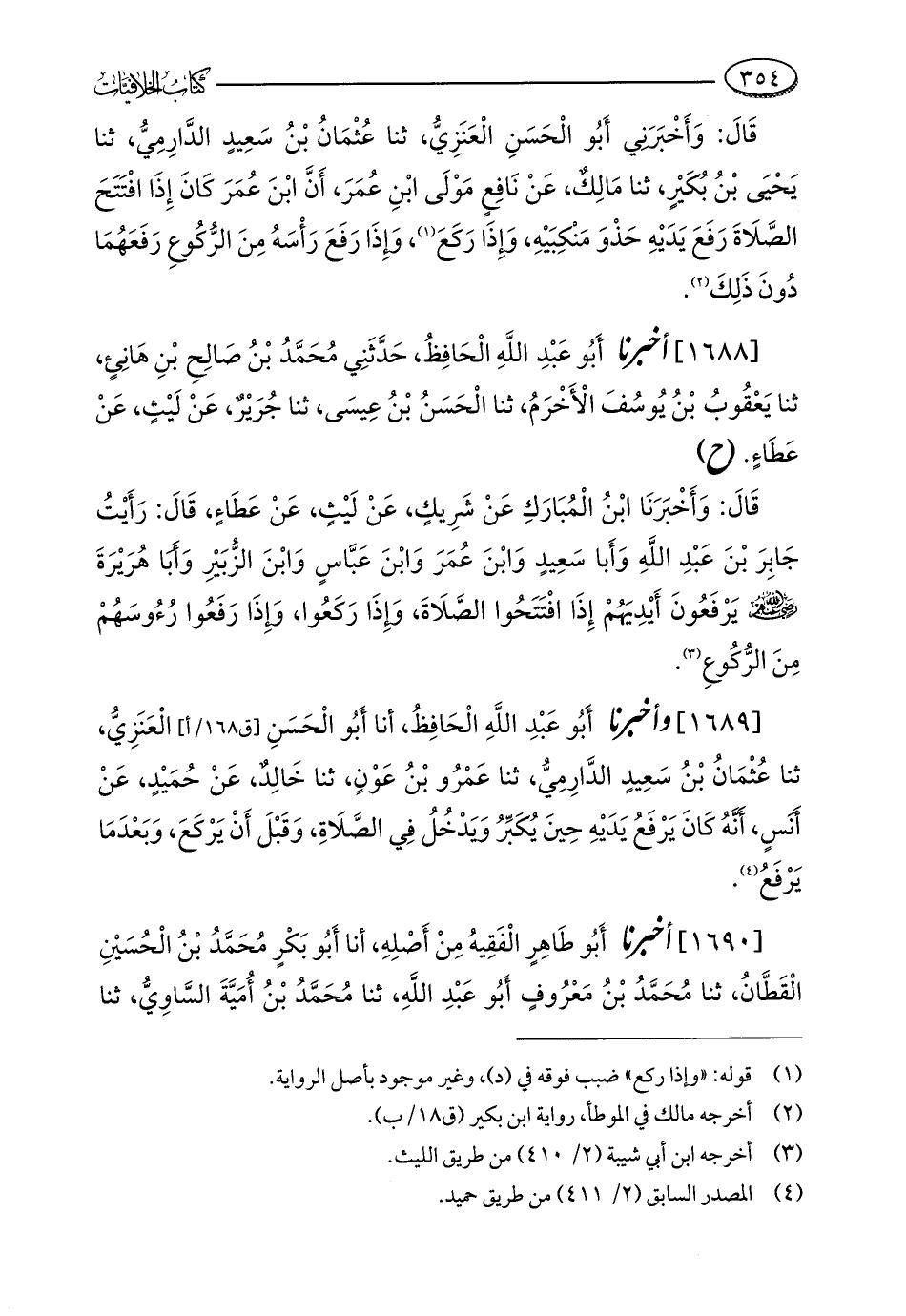 [1689] وأخبرنا أَبُو عَبْدِ اللَّهِ الْحَافِظُ، أنا أَبُو الْحَسَنِ الْعَنَزِيُّ، ثنا عُثْمَانُ بْنُ سَعِيدٍ الدَّارِمِيُّ، ثنا عَمْرُو بْنُ عَوْنٍ، ثنا خَالِدٌ، عَنْ حُمَيْدٍ، عَنْ أَنَسٍ، أَنَّهُ كَانَ يَرْفَعُ يَدَيْهِ حِينَ يُكَبِّرُ وَيدْخُلُ فِي الصَّلَاةِ، وَقَبْلَ أَنْ يَرْكَعَ، وَبَعْدَ مَا يَرْفَعُ (¬4).