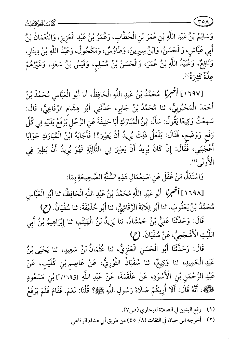[1697] أخبرنا مُحَمَّدُ بْنُ عَبْدِ اللَّهِ الْحَافِظُ، أنا أَبُو الْعَبَّاسِ مُحَمَّدُ بْنُ أَحْمَدَ الْمَحْبُوبِيُّ، ثنا مُحَمَّدُ بْنُ جَابِرٍ، حَدَّثَنِي أَبُو هِشَامٍ الرِّفَاعِيُّ، قَالَ: سَمِعْتُ وَكِيعًا يَقُولُ: سَأَلَ ابْنُ الْمُبَارَكِ أَبَا حَنِيفَةَ عَنِ الرَّجُلِ يَرْفَعُ يَدَيْهِ فِي كُلِّ رَفْعٍ وَوَضْعٍ، فَقَالَ: يَفْعَلُ ذَلِكَ يُرِيدُ أَنْ يَطِيرَ؟ ! فَأَجَابَهُ ابْنُ الْمُبَارَكِ جَوَابًا أَعْجَبَنِي، فَقَالَ: إِنْ كَانَ يُرِيدُ أَنْ يَطِيرَ فِي الثَّالِثَةِ فَهُوَ يُرِيدُ أَنْ يَطِيرَ فِي الْأُولَى (¬2).