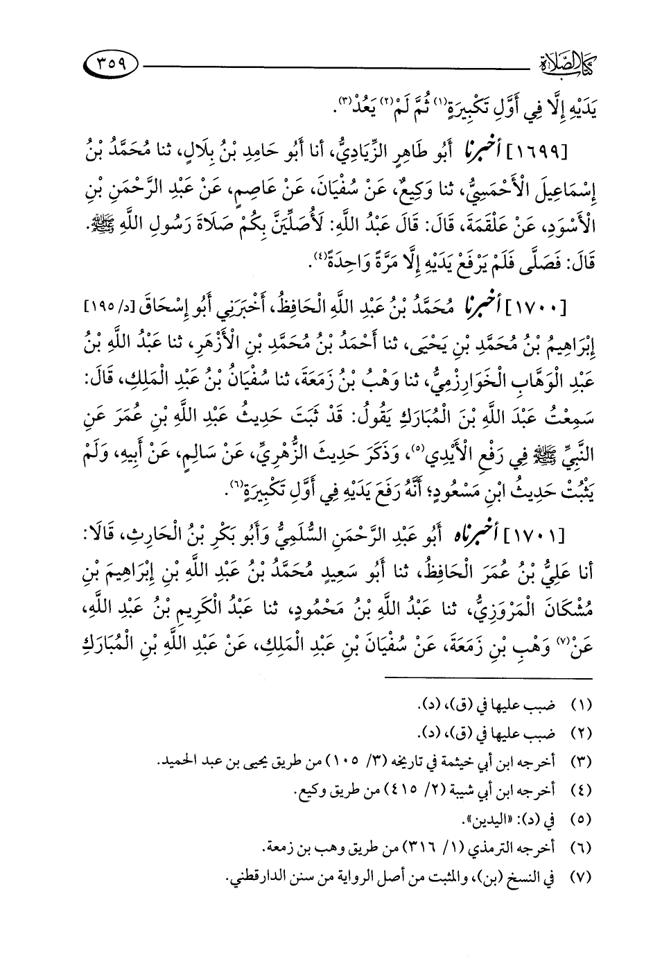 [1699] أخبرنا أَبُو طَاهِرٍ الزِّيَادِيُّ، أنا أَبُو حَامِدِ بْنُ بِلَالٍ، ثنا مُحَمَّدُ بْنُ إِسْمَاعِيلَ الْأَحْمَسِيُّ، ثنا وَكِيعٌ، عَنْ سُفْيَانَ، عَنْ عَاصِمٍ، عَنْ عَبْدِ الرَّحْمَنِ بْنِ الْأَسْوَدِ، عَنْ عَلْقَمَةَ، قَالَ: قَالَ عَبْدُ اللَّهِ: لَأُصَلِّيَنَّ بِكُمْ صَلَاةَ رَسُولِ اللَّهِ - صلى الله عليه وسلم -. قَالَ: فَصَلَّى فَلَمْ يَرْفَعْ يَدَيْهِ إِلَّا مَرَّةً وَاحِدَةً (¬4).