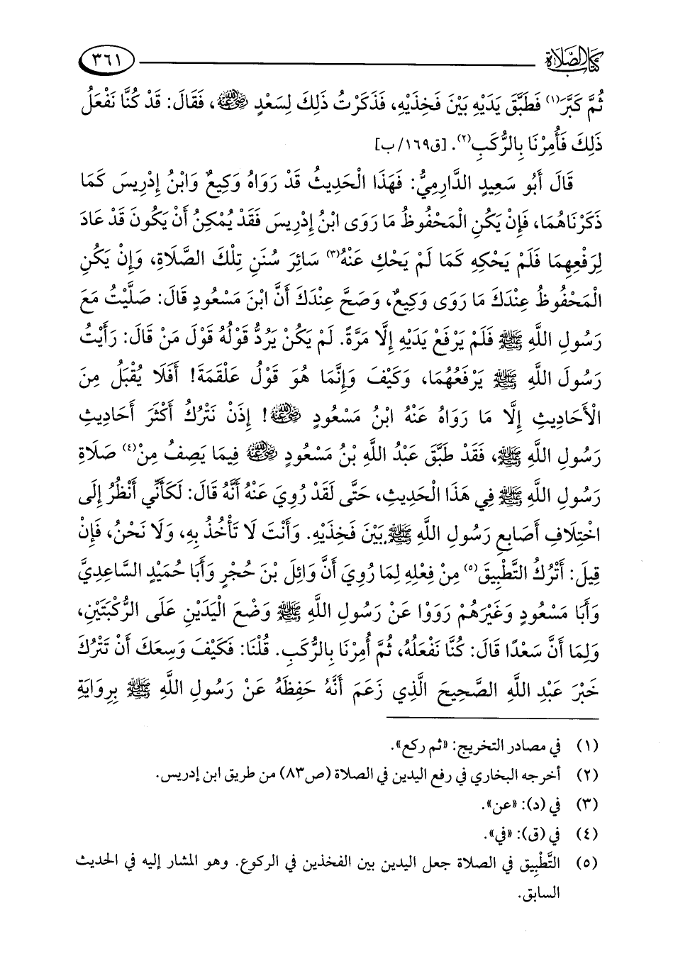 قَالَ أَبُو سَعِيدٍ الدَّارِمِيُّ: فَهَذَا الْحَدِيثُ قَدْ رَوَاهُ وَكِيعٌ وَابْنُ إِدْرِيسَ كَمَا ذَكَرْنَاهُمَا، فَإِنْ يَكُنِ الْمَحْفُوظُ مَا رَوَى ابْنُ إِدْرِيسَ فَقَدْ يُمْكِنُ أَنْ يَكُونَ قَدْ عَادَ لِرَفْعِهِمَا فَلَمْ يَحْكِهِ كَمَا لَمْ يَحْكِ عَنْهُ (¬3) سَائِرَ سُنَنِ تِلْكَ الصَّلَاةِ، وَإِنْ يَكُنِ الْمَحْفُوظُ عِنْدَكَ مَا رَوَى وَكِيعٌ، وَصَحَّ عِنْدَكَ أَنَّ ابْنَ مَسْعُودٍ قَالَ: صَلَّيْتُ مَعَ رَسُولِ اللَّهِ - صلى الله عليه وسلم - فلَمْ يَرْفَعْ يَدَيْهِ إِلَّا مَرَّةً. لَمْ يَكُنْ يَرُدُّ قَوْلُهُ قَوْلَ مَنْ قَالَ: رَأَيْتُ رَسُولَ اللَّهِ - صلى الله عليه وسلم - يرْفَعُهُمَا، وَكَيْفَ وَإِنَّمَا هُوَ قَوْلُ عَلْقَمَةَ! أَفَلَا يُقْبَلُ مِنَ الْأَحَادِيثِ إِلَّا مَا رَوَاهُ عَنْهُ ابْنُ مَسْعُودٍ - رضي الله عنه -! إِذَنْ نَتْرُكُ أَكْثَرَ أَحَادِيثِ رَسُولِ اللَّهِ - صلى الله عليه وسلم -، فَقَدْ طَبَّقَ عَبْدُ اللَّهِ بْنُ مَسْعُودٍ - رضي الله عنه - فِيمَا يَصِفُ مِنْ (¬4) صَلَاةِ رَسُولِ اللَّهِ - صلى الله عليه وسلم - فِي هَذَا الْحَدِيثِ، حَتَّى لَقَدْ رُوِيَ عَنْهُ أَنَّهُ قَالَ: لَكَأَنِّي أَنْظُرُ إِلَى اخْتِلَافِ أَصَابِعِ رَسُولِ اللَّهِ - صلى الله عليه وسلم - بَيْنَ فَخِذَيْهِ. وَأَنْتَ لَا تَأْخُذُ بِهِ، وَلَا نَحْنُ، فَإِنْ قِيلَ: أَتْرُكُ التَّطْبِيقَ (¬5) مِنْ فِعْلِهِ لِمَا رُوِيَ أَنَّ وَائِلَ بْنَ حُجْرٍ وَأَبَا حُمَيْدٍ السَّاعِدِيَّ وَأَبَا مَسْعُودٍ وَغَيْرَهُمْ رَوَوْا عَنْ رَسُولِ اللَّهِ - صلى الله عليه وسلم - وَضْعَ الْيَدَيْنِ عَلَى الرُّكْبَتَيْنِ، وَلِمَا أَنَّ سَعْدًا قَالَ: كُنَّا نَفْعَلُهُ، ثُمَّ أُمِرْنَا بِالرُّكَبِ. قُلْنَا: فَكَيْفَ وَسِعَكَ أَنْ تَتْرُكَ خَبْرَ عَبْدِ اللَّهِ الصَّحِيحَ الَّذِي زَعَمَ أَنَّهُ حَفِظَهُ عَنْ رَسُولِ اللَّهِ - صلى الله عليه وسلم - بِرِوَايَةِ