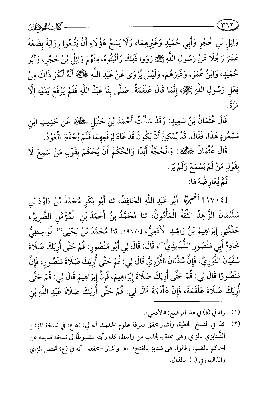 [1704] أخبرنا أَبُو عَبْدِ اللَّهِ الْحَافِظُ، ثنا أَبُو بَكْرٍ مُحَمَّدُ بْنُ دَاوُدَ بْنِ سُلَيْمَانَ الزَّاهِدُ الثِّقَةُ الْمَأْمُونُ، ثنا مُحَمَّدُ بْنُ أَحْمَدَ بْنِ الْمُؤَمَّلِ الضَّرِيرُ، حَدَّثَنِي إِبْرَاهِيمُ بْنُ رَاشِدٍ الْأَدَمِيُّ، ثنا مُحَمَّدُ بْنُ يَحْيَى (¬1) الْوَاسِطِيُّ خَادِمُ أَبِي مَنْصُورٍ الشُّنَابذِيُّ (¬2)، قَالَ: قَالَ لِي أَبُو مَنْصُورٍ: قُمْ حَتَّى أُرِيَكَ صَلَاةَ سُفْيَانَ الثَّوْرِيِّ، فَإِنَّ سُفْيَانَ الثَّوْرِيَّ قَالَ لِي: قُمْ حَتَّى أُرِيَكَ صَلَاةَ مَنْصُورٍ، فَإِنَّ مَنْصُورًا قَالَ لِي: قُمْ حتَّى أُرِيَكَ صَلَاةَ إِبْرَاهِيمَ، فَإِنَّ إِبْرَاهِيمَ قَالَ لِي: قُمْ حَتَّى أُرِيَكَ صَلَاةَ عَلْقَمَةَ، فَإِنَّ عَلْقَمَةَ قَالَ لِي: قُمْ حَتَّى أُرِيَكَ صَلَاةَ عَبْدِ اللَّهِ بْنِ