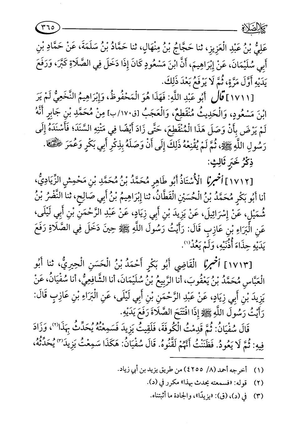 [1712] أخبرنا الْأُسْتَاذُ أَبُو طَاهِرٍ مُحَمَّدُ بْنُ مُحَمَّدِ بْنِ مَحْمِشٍ الزِّيَادِيُّ، أنا أَبُو بَكْرٍ مُحَمَّدُ بْنُ الْحُسَيْنِ الْقَطَّانُ، ثنا إِبْرَاهِيمُ بْنُ أَبِي صَالِحٍ، ثنا النَّضْرُ بْنُ شُمَيْلٍ، عَنْ إِسْرَائِيلَ، عَنْ يَزِيدَ بْنِ أَبِي زِيَادٍ، عَنْ عَبْدِ الرَّحْمَنِ بْنِ أَبِي لَيْلَى، عَنِ الْبَرَاءِ بْنِ عَازِبٍ قَالَ: رَأَيْتُ رَسُولَ اللَّهِ - صلى الله عليه وسلم - حِينَ دَخَلَ فِي الصَّلَاةِ رَفَعَ يَدَيْهِ حِذَاءَ أُذُنَيْهِ، وَلَمْ يَعُدْ (¬1).