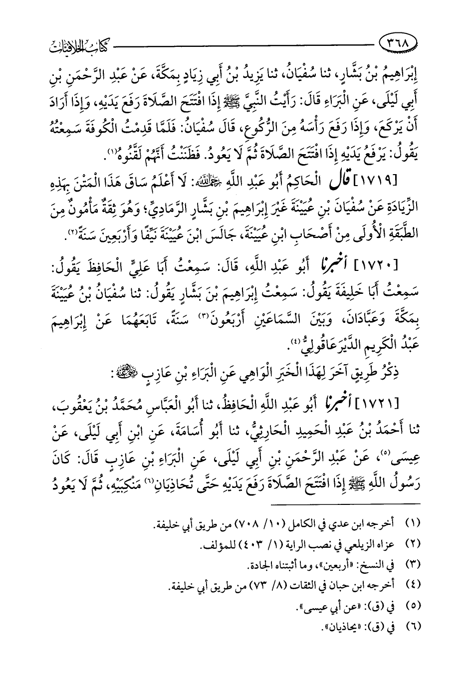 [1721] أخبرنا أَبُو عَبْدِ اللَّهِ الْحَافِظُ، ثنا أَبُو الْعَبَّاسِ مُحَمَّدُ بْنُ يَعْقُوبَ، ثنا أَحْمَدُ بْنُ عَبْدِ الْحَمِيدِ الْحَارِثِيُّ، ثنا أَبُو أُسَامَةَ، عَنِ ابْنِ أَبِي لَيْلَى، عَنْ عِيسَى (¬5)، عَنْ عَبْدِ الرَّحْمَنِ بْنِ أَبِي لَيْلَى، عَنِ الْبَرَاءِ بْنِ عَازِبٍ قَالَ: كَانَ رَسُولُ اللَّهِ - صلى الله عليه وسلم - إذَا افْتَتَحَ الصَّلَاةَ رَفَعَ يَدَيْهِ حَتَّى تُحَاذِيَانِ (¬6) مَنْكِبَيْهِ، ثُمَّ لَا يَعُودُ