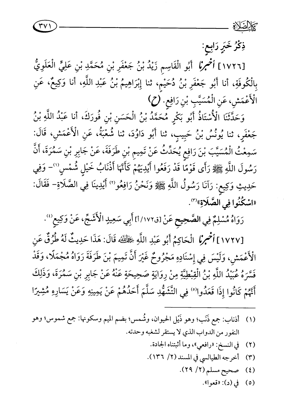 وَحَدَّثَنَا الْأُسْتَاذُ أَبُو بَكْرٍ مُحَمَّدُ بْنُ الْحَسَنِ بْنِ فُورَكَ، أنا عَبْدُ اللَّهِ بْنُ جَعْفَرٍ، ثنا يُونُسُ بْنُ حَبِيبٍ، ثنا أَبُو دَاوُدَ، ثنا شُعْبَةُ، عَنِ الْأَعْمَشِ، قَالَ: سَمِعْتُ الْمُسَيَّبَ بْنَ رَافِعٍ يُحَدِّثُ عَنْ تَمِيمِ بْنِ طَرَفَةَ، عَنْ جَابِرِ بْنِ سَمُرَةَ، أَنَّ رَسُولَ اللَّهِ - صلى الله عليه وسلم - رأَى قَوْمًا قَدْ رَفَعُوا أَيْدِيَهُمْ كَأَنَّهَا أَذْنَابُ خَيْلٍ شُمْسٍ (¬1) - وَفِي حَدِيثِ وَكِيعٍ: رَآنَا رَسُولُ اللَّهِ - صلى الله عليه وسلم - ونَحْنُ رَافِعُو (¬2) أَيْدِينَا فِي الصَّلَاةِ - فَقَالَ: "اسْكُنُوا فِي الصَّلَاةِ" (¬3).