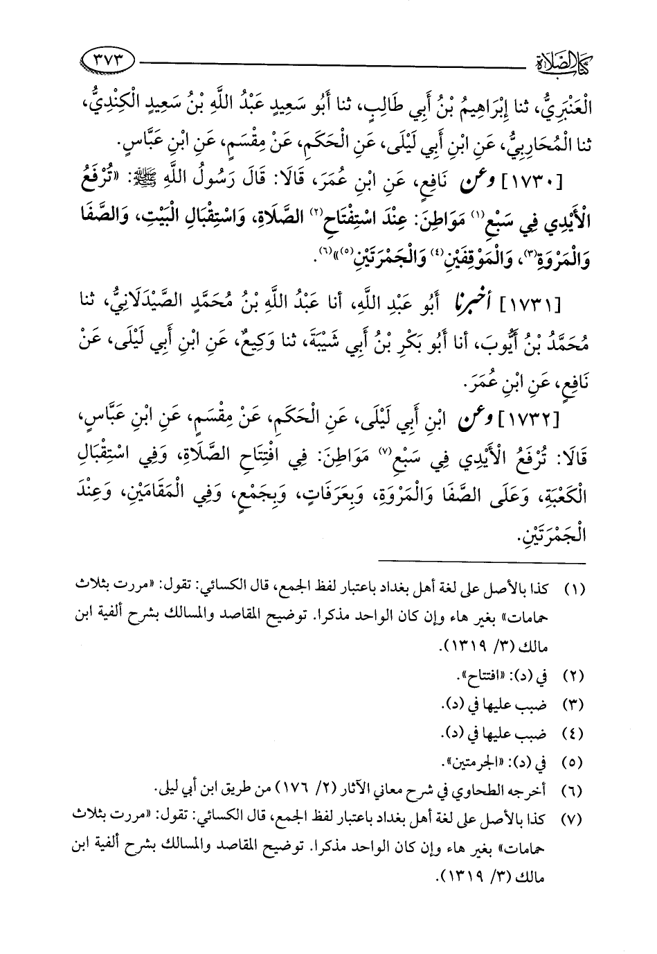 [1732] وعن ابْنِ أَبِي لَيْلَى، عَنِ الْحَكَمِ، عَنْ مِقْسَمٍ، عَنِ ابْنِ عَبَّاسٍ، قَالَا: تُرْفَعُ الْأَيْدِي فِي سَبْعِ (¬7) مَوَاطِنَ: فِي افْتِتَاحِ الصَّلَاةِ، وَفِي اسْتِقْبَالِ الْكَعْبَةِ، وَعَلَى الصَّفَا وَالْمَرْوةِ، وَبِعَرَفَاتٍ، وَبِجَمْعٍ، وَفِي الْمَقَامَيْنِ، وَعِنْدَ الْجَمْرَتَيْنِ.