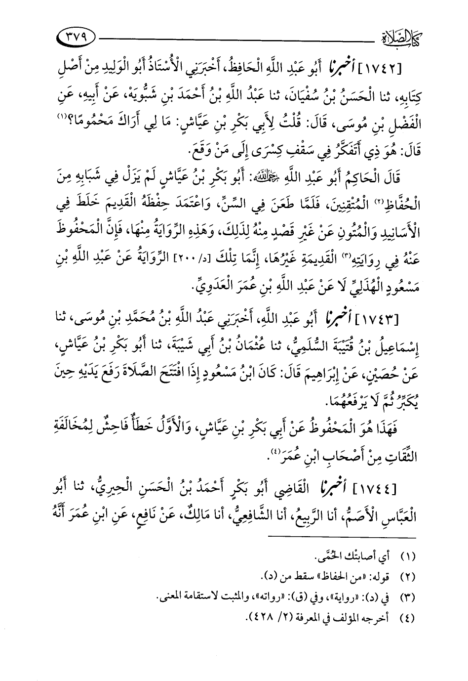 [1743] أخبرنا أَبُو عَبْدِ اللَّهِ، أَخْبَرَنِي عَبْدُ اللَّهِ بْنُ مُحَمَّدِ بْنِ مُوسَى، ثنا إِسْمَاعِيلُ بْنُ قُتَيْبَةَ السُّلَمِيُّ، ثنا عُثْمَانُ بْنُ أَبِي شَيْبَةَ، ثنا أَبُو بَكْرِ بْنُ عَيَّاشٍ، عَنْ حُصَيْنٍ، عَنْ إِبْرَاهِيمَ قَالَ: كَانَ ابْنُ مَسْعُودٍ إِذَا افْتَتَحَ الصَّلَاةَ رَفَعَ يَدَيْهِ حِينَ يُكَبِّرُ ثُمَّ لَا يَرْفَعُهُمَا.