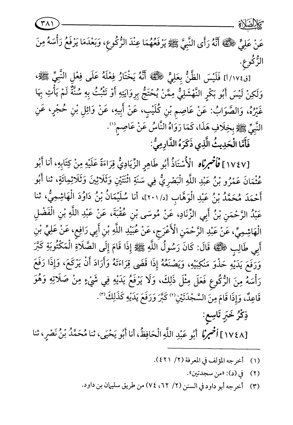 [1747] فأخبرناه الْأُسْتَاذُ أَبُو طَاهِرٍ الزِّيَادِيُّ قِرَاءَةً عَلَيْهِ مِنْ كِتَابِهِ، أنا أَبُو عُثْمَانَ عَمْرُو بْنُ عَبْدِ اللَّهِ الْبَصْرِيُّ فِي سَنَةِ اثْنَتَيْنِ وَثَلَاثِينَ وَثَلَاثِمِائَةٍ، ثنا أَبُو أَحْمَدَ مُحَمَّدُ بْنُ عَبْدِ الْوَهَّابِ، أنا سُلَيْمَانُ بْنُ دَاوُدَ الْهَاشِمِيُّ، ثنا عَبْدُ الرَّحْمَنِ بْنُ أَبِي الزِّنَادِ، عَنْ مُوسَى بْنِ عُقْبَةَ، عَنْ عَبْدِ اللَّهِ بْنِ الْفَضْلِ الْهَاشِمِيِّ، عَنْ عَبْدِ الرَّحْمَنِ الْأَعْرَجِ، عَنْ عُبَيْدِ اللَّهِ بْنِ أَبِي رَافِعٍ، عَنْ عَلِيِّ بْنِ أَبِي طَالِبٍ - رضي الله عنه - قَالَ: كَانَ رَسُولُ اللَّهِ - صلى الله عليه وسلم - إِذَا قَامَ إِلَى الصَّلَاةِ الْمَكْتُوبَةِ كَبَّرَ وَرَفَعَ يَدَيْهِ حَذْوَ مَنْكِبَيْهِ، وَيَصْنَعُهُ إِذَا قَضَى قِرَاءَتَهُ وَأَرَادَ أَنْ يَرْكَعَ، وَإِذَا رَفَعَ رَأْسَهُ مِنَ الرُّكُوعِ فَعَلَ مِثْلَ ذَلِكَ، وَلَا يَرْفَعُ يَدَيْهِ فِي شَيْءٍ مِنْ صَلَاتِهِ وَهُوَ قَاعِدٌ، وَإِذَا قَامَ مِنَ السَّجْدَتَيْنِ (¬2) كَبَّرَ وَرَفَعَ يَدَيْهِ كَذَلِكَ (¬3).