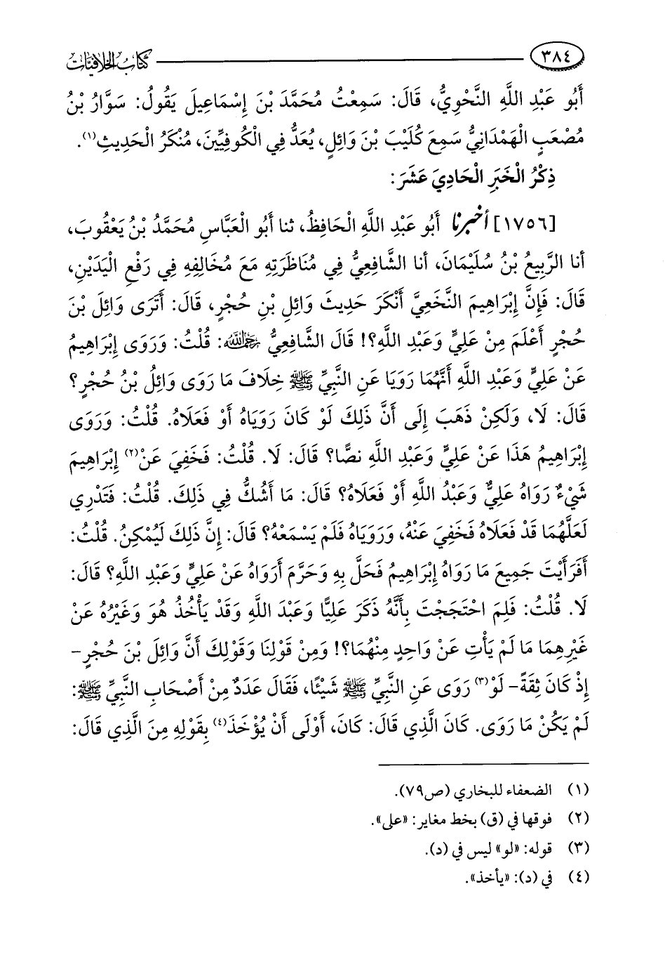 [1756] أخبرنا أَبُو عَبْدِ اللَّهِ الْحَافِظُ، ثنا أَبُو الْعَبَّاسِ مُحَمَّدُ بْنُ يَعْقُوبَ، أنا الرَّبِيعُ بْنُ سُلَيْمَانَ، أنا الشَّافِعِيُّ فِي مُنَاظَرَتِهِ مَعَ مُخَالِفِهِ فِي رَفْعِ الْيَدَيْنِ، قَالَ: فَإِنَّ إِبْرَاهِيمَ النَّخَعِيَّ أَنْكَرَ حَدِيثَ وَائِلِ بْنِ حُجْرٍ، قَالَ: أَتَرَى وَائِلَ بْنَ حُجْرٍ أَعْلَمَ مِنْ عَلِيٍّ وَعَبْدِ اللَّهِ؟ ! قَالَ الشَّافِعِيُّ - رحمه الله -: قُلْتُ: وَرَوَى إِبْرَاهِيمُ عَنْ عَلِيٍّ وَعَبْدِ اللَّهِ أَنَّهُمَا رَوَيَا عَنِ النَّبِيِّ - صلى الله عليه وسلم - خِلَافَ مَا رَوَى وَائِلُ بْنُ حُجْرٍ؟ قَالَ: لَا، وَلَكِنْ ذَهَبَ إِلَى أَنَّ ذَلِكَ لَوْ كَانَ رَوَيَاهُ أَوْ فَعَلَاهُ. قُلْتُ: وَرَوَى إِبْرَاهِيمُ هَذَا عَنْ عَلِيٍّ وَعَبْدِ اللَّهِ نصًّا؟ قَالَ: لَا. قُلْتُ: فَخَفِيَ عَنْ (¬2) إِبْرَاهِيمَ شَيْءٌ رَوَاهُ عَلِيٌّ وَعَبْدُ اللَّهِ أَوْ فَعَلَاهُ؟ قَالَ: مَا أَشُكُّ فِي ذَلِكَ. قُلْتُ: فَتَدْرِي لَعَلَّهُمَا قَدْ فَعَلَاهُ فَخَفِيَ عَنْهُ، وَرَوَيَاهُ فَلَمْ يَسْمَعْهُ؟ قَالَ: إِنَّ ذَلِكَ لَيُمْكِنُ. قُلْتُ: أَفَرَأَيْتَ جَمِيعَ مَا رَوَاهُ إِبْرَاهِيمُ فَحَلَّ بِهِ وَحَرَّمَ أَرَوَاهُ عَنْ عَلِيٍّ وَعَبْدِ اللَّهِ؟ قَالَ: لَا. قُلْتُ: فَلِمَ احْتَجَجْتَ بِأَنَّهُ ذَكَرَ عَلِيًّا وَعَبْدَ اللَّهِ وَقَدْ يَأْخُذُ هُوَ وَغَيْرُهُ عَنْ غَيْرِهِمَا مَا لَمْ يَأْتِ عَنْ وَاحِدٍ مِنْهُمَا؟ ! وَمِنْ قَوْلِنَا وَقَوْلِكَ أَنَّ وَائِلَ بْنَ حُجْرٍ - إِذْ كَانَ ثِقَةً - لَوْ (¬3) رَوَى عَنِ النَّبِيِّ - صلى الله عليه وسلم - شَيْئًا، فَقَالَ عَدَدٌ مِنْ أَصْحَابِ النَّبِيِّ - صلى الله عليه وسلم -: لَمْ يَكُنْ مَا رَوَى. كَانَ الَّذِي قَالَ: كَانَ، أَوْلَى أَنْ يُؤْخَذَ (¬4) بِقَوْلِهِ مِنَ الَّذِي قَالَ: