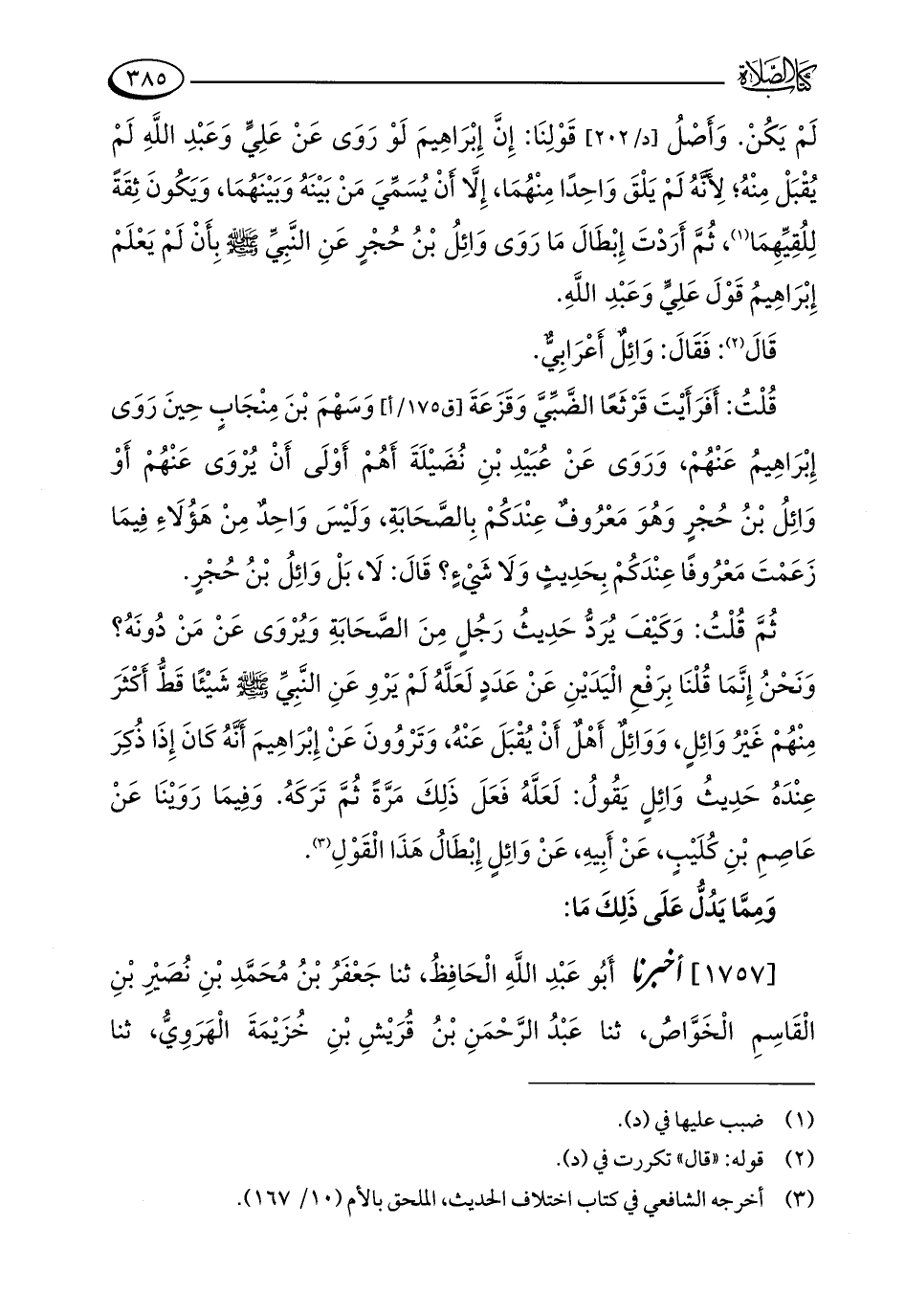 قُلْتُ: أَفَرَأَيْتَ قَرْثَعًا الضَّبِّيَّ وَقَزَعَةَ وَسَهْمَ بْنَ مِنْجَابٍ حِينَ رَوَى إِبْرَاهِيمُ عَنْهُمْ، وَرَوَى عَنْ عُبَيْدِ بْنِ نُضَيْلَةَ أَهُمْ أَوْلَى أَنْ يُرْوَى عَنْهُمْ أَوْ وَائِلُ بْنُ حُجْرٍ وَهُوَ مَعْرُوفٌ عِنْدَكُمْ بِالصَّحَابَةِ، وَلَيْسَ وَاحِدٌ مِنْ هَؤُلَاءِ فِيمَا زَعَمْتَ مَعْرُوفًا عِنْدَكُمْ بِحَدِيثٍ وَلَا شَيْءٍ؟ قَالَ: لَا، بَلْ وَائِلُ بْنُ حُجْرٍ.