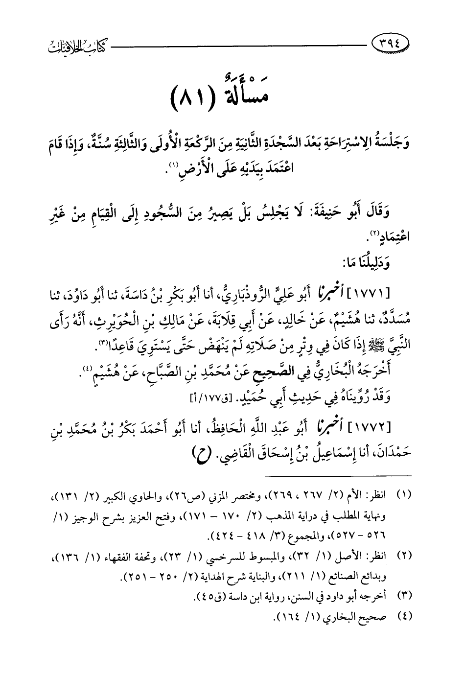 [1771] أخبرنا أَبُو عَلِيٍّ الرُّوذْبَارِيُّ، أنا أَبُو بَكْرِ بْنُ دَاسَةَ، ثنا أَبُو دَاوُدَ، ثنا مُسَدَّدٌ، ثنا هُشَيْمٌ، عَنْ خَالِدٍ، عَنْ أَبِي قِلَابَةَ، عَنْ مَالِكِ بْنِ الْحُوَيْرِثِ، أَنَّهُ رَأَى النَّبِيَّ - صلى الله عليه وسلم - إِذَا كَانَ فِي وِتْرٍ مِن صَلَاتِهِ لَمْ يَنْهَضْ حَتَّى يَسْتَوِيَ قَاعِدًا (¬3).