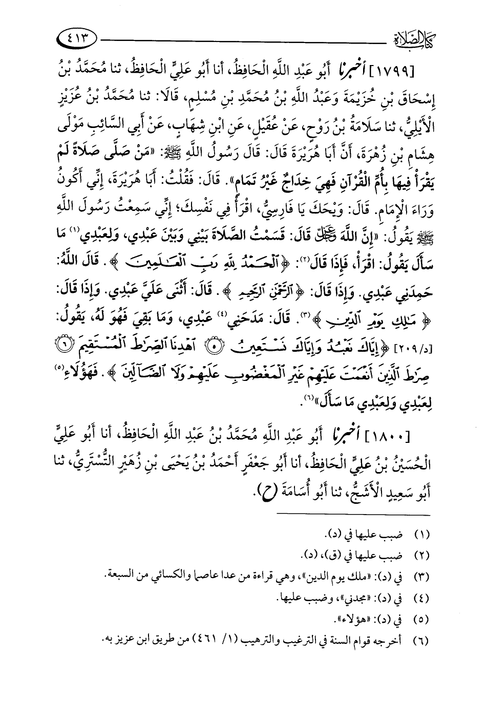 [1799] أخبرنا أَبُو عَبْدِ اللَّهِ الْحَافِظُ، أنا أَبُو عَلِيٍّ الْحَافِظُ، ثنا مُحَمَّدُ بْنُ إِسْحَاقَ بْنِ خُزَيْمَةَ وَعَبْدُ اللَّهِ بْنُ مُحَمَّدِ بْنِ مُسْلِمٍ، قَالَا: ثنا مُحَمَّدُ بْنُ عُزَيْزٍ الْأَيْلِيُّ، ثنا سَلَامَةُ بْنُ رَوْحٍ، عَنْ عُقَيْلٍ، عَنِ ابْنِ شِهَابٍ، عَنْ أَبِي السَّائِبِ مَوْلَى هِشَامِ بْنِ زُهْرَةَ، أَنَّ أَبَا هُرَيْرَةَ قَالَ: قَالَ رَسُولُ اللَّهِ - صلى الله عليه وسلم -: "مَنْ صلَّى صَلَاةً لَمْ يَقْرَأْ فِيهَا بِأُمِّ الْقُرْآنِ فَهِيَ خِدَاجٌ غَيْرُ تَمَامٍ". قَالَ: فَقُلْتُ: أَبَا هُرَيْرَةَ، إِنِّي أَكُونُ وَرَاءَ الْإِمَامِ. قَالَ: وَيْحَكَ يَا فَارِسِيُّ، اقْرَأْ فِي نَفْسِكَ؛ إِنِّي سَمِعْتُ رَسُولَ اللَّهِ - صلى الله عليه وسلم - يَقُولُ: "إِنَّ اللَّهَ - عز وجل - قَالَ: قَسَمْتُ الصَّلَاةَ بَيْنِي وَبَيْنَ عَبْدِي، وَلِعَبْدِي (¬1) مَا سَأَلَ يَقُولُ: اقْرَأْ، فَإِذَا قَالَ (¬2): {الْحَمْدُ لِلَّهِ رَبِّ الْعَالَمِينَ}. قَالَ اللَّهُ: حَمِدَنِي عَبْدِي. وَإِذَا قَالَ: {الرَّحْمَنِ الرَّحِيمِ}. قَالَ: أَثْنَى عَلَيَّ عَبْدِي. وَإِذَا قَالَ: {مَالِكِ يَوْمِ الدِّينِ} (¬3). قَالَ: مَدَحَنِي (¬4) عَبْدِي، وَمَا بَقِيَ فَهُوَ لَهُ، يَقُولُ: {إِيَّاكَ نَعْبُدُ وَإِيَّاكَ نَسْتَعِينُ (5) اهْدِنَا الصِّرَاطَ الْمُسْتَقِيمَ (6) صِرَاطَ الَّذِينَ أَنْعَمْتَ عَلَيْهِمْ غَيْرِ الْمَغْضُوبِ عَلَيْهِمْ وَلَا الضَّالِّينَ}. فَهَؤُلَاءِ (¬5) لِعَبْدِي وَلِعَبْدِي مَا سَأَلَ" (¬6).